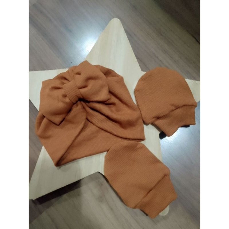 Touca turbante com laço e luvas RN