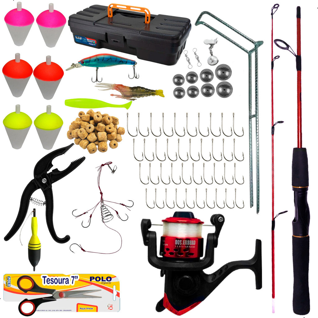 Kit Pesca Completo Vara Molinete Maleta Pronto Para Usar, ideal para uso em pesqueiros, lagos, rios, represas e outros. ESPECIFICAÇÕES 1 Vara para Molinete 1,20m suporta 6KG Fibra de Vidro cabo em EVA, passadores em cerâmica, em duas partes, medindo 64 cm cada uma, cor conforme disponibilidade em estoque 1 Molinete Toto 200 BH200 ou Sol da Marine Sports ou Jimmy com 1 rolamento, sistema balanceado, relação de recolhimento 5.2:1, carretel em plástico, super leve e macio para uso. Capacidade de linha 0,18mm 245m 0,20mm 200m 0,25mm 125m 1 linha 0,20 ou 0,25 com 100 metros monofilamento marca conforme a disponilibidade Anzol 4330 Super Strong Marine Sports Niquelado Nickel, pois possui farpas muito eficiente que auxilia na fisgada do peixe. 10 Anzol 4330 Nº1 (3,1 cm) 10 Anzol 4330 Nº6 (2,0 cm) 10 Anzol 4330 Nº8 (1,8cm) 10 Anzol 4330 Nº10 (1,5 cm) Chumbo bolinha, utilizado para pesca de fundo. 2 Chumbo de 2gr 2 Chumbo de 6gr 2 Chumbo de 8gr 2 Chumbo de 10gr Boia em isopor colorida, possui um bastão de plastico para a passagem da linha. 2 Boia nº4 2 Boia nº5 2 Boia nº3 2 Giradores simples em aço carbono nº7, Utilizado para evitar torção da linha. 1 Sinete/Guizo de Espera utilizado em varas para deixar em espera aguardando o peixe puxar. 1 Pacote com isca furadinha 100 gramas 1 Boia de Arremesso 1 Tesoura muito usada na pesca para corte de linha 1 Alicate de Pesca Contenção Pega Peixe HI 1 Maleta Multiuso Combat 5060 Preta Arqplast 1 Isca artificial meia água 1 Isca camarão artificial 8cm cor conforme disponibilidade em estoque 1 Isca Lambari cor conforme disponibilidade em estoque 3 Anzol Maruseigo Nickel N20 Marine 1 Suporte para vara em aço galvanizado 1 Chuveirinho número 8