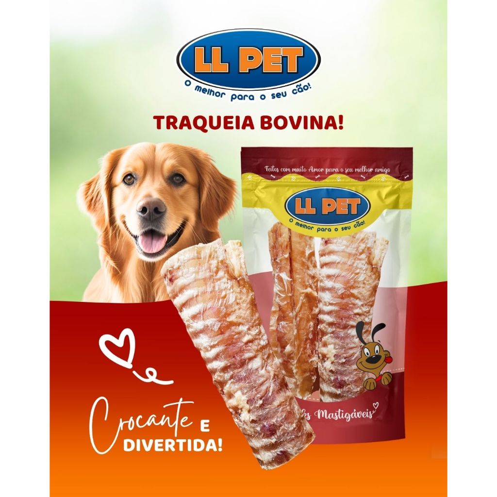 Traqueia Bovina LL Pet – Petisco Natural para Cães | Embalagem com unidades selecionadas Ofereça ao seu cão um petisco saudável, saboroso e que cuida da saúde! A Traqueia Bovina LL Pet é um snack 100% natural, rico em colágeno e cartilagem, ideal para manter as articulações saudáveis, ajudar na limpeza dos dentes e proporcionar longos momentos de distração e bem-estar. 🐾 Benefícios da Traqueia Bovina LL Pet: ✔ 100% natural e sem conservantes ✔ Rica em colágeno, ótima para as articulações ✔ Ajuda a reduzir o tártaro e fortalece a mastigação ✔ Ideal para cães de todos os portes ✔ Produto brasileiro, com controle de qualidade 💡Dica: Pode ser recheada com patê ou ração úmida para enriquecer ainda mais a experiência do seu pet! ❗Uso recomendado: Como todo petisco, a traqueia bovina deve ser oferecida com moderação, como complemento alimentar. Sempre supervisione seu cão durante o consumo e mantenha água fresca disponível.