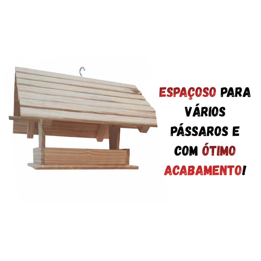 🐦 Tratador de Pássaros em Madeira – Modelo Luxo O Tratador Luxo para Pássaros é ideal para quem busca praticidade, durabilidade e um visual rústico elegante. Fabricado em madeira natural, ele oferece um espaço adequado para alimentação, protegendo a ração da chuva e evitando desperdícios. Seu design em formato de casinha proporciona conforto às aves, além de valorizar o ambiente onde é instalado, seja em quintais, varandas, jardins ou viveiros. ✨ Diferenciais do Produto: Produzido em madeira natural resistente Design tipo casinha com telhado inclinado, que protege a ração Possui poleiro, facilitando o acesso das aves Gancho metálico para pendurar com segurança Acabamento rústico e funcional Fácil de limpar e reabastecer 📏 Dimensões Aproximadas: Altura: 30,5 cm Comprimento: 32 cm Largura: 20 cm 🐤 Indicado para: Pássaros de pequeno e médio porte, como: Calopsitas Periquitos Agapórnis Canários