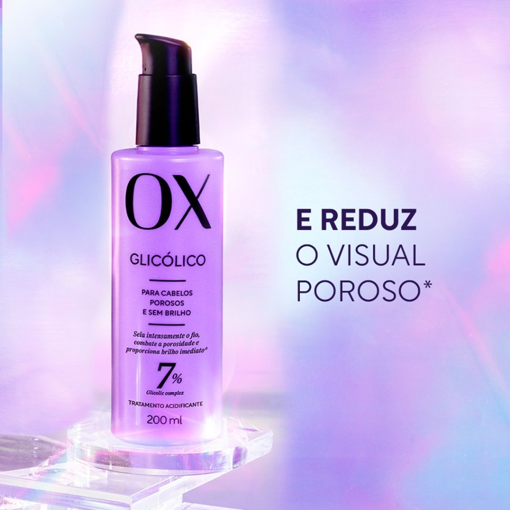 Tratamento Acidificante Ox Glicólico 200Ml A Linha OX Glicólico é a ideal para cabelos porosos e sem brilho. Isso porque o Glicolic complex combinado ao Sistema OX Beleza Duradoura, é a fórmula certa para selar intensamente os fios, combater a porosidade e proporcionar brilho imediato Sistema OX Beleza Duradoura é uma tecnologia exclusiva, capaz de liberar sequencialmente os ingredientes, proporcionando um tratamento prolongado aos fios. INDICAÇÃO DE USO: Ainda com o condicionador aplicado, sem enxaguar, aplique o Tratamento Acidificante nos fios cobrindo-os do comprimento às pontas. Deixe agir por 5 minutos e depois enxágue. É recomendada a utilização 2 vezes na semana. Para melhores resultados utilize toda a linha OX Glicólico. BENEFICIOS: 1. Brilho imediato por até 96h 2. Hidrata por até 120h 3. Sela intensamente os fios 4. Reduz o aspecto poroso 5. Preserva a estrutura da queratina dos fios 6. Preenche a fibra capilar 7. Restaura os danos 8. Cabelos saudáveis 9. Suavidade aos fios 10. Reestabelece o nível de hidratação do cabelo CÓDIGO DO PRODUTO: 405426