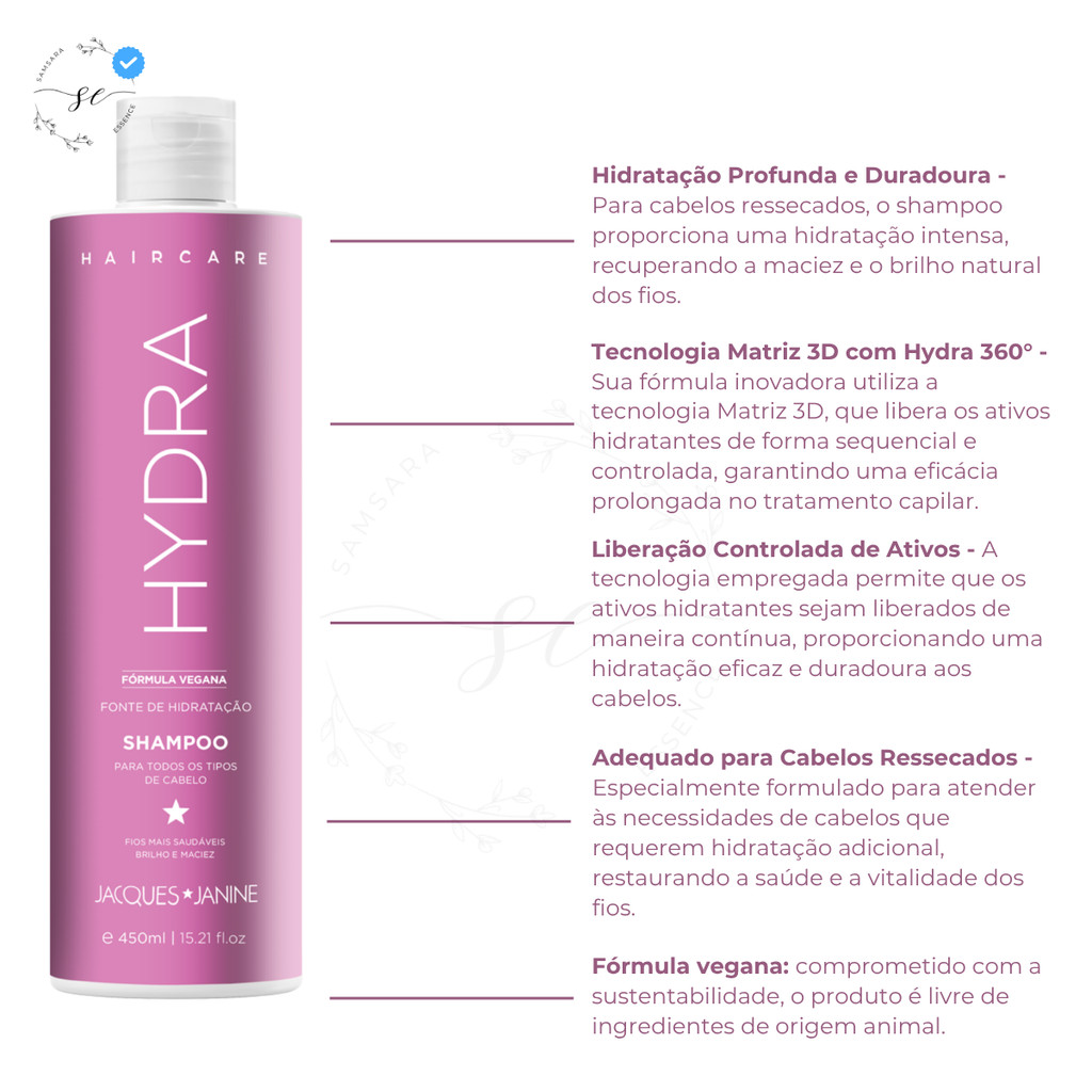 Jacques Janine Haircare – Tratamentos Profissionais para Todos os Tipos de Cabelo Transforme seu cuidado diário com os cabelos em um ritual de beleza profissional. A linha Jacques Janine Haircare oferece fórmulas veganas, livres de parabenos e sal, não testadas em animais e com resultados visíveis desde a primeira aplicação. Escolha o tratamento ideal para as necessidades do seu cabelo: Shampoo 450ml Condicionador 440ml 💙 Purify – Controle da Oleosidade Limpeza profunda sem ressecar. Controla a oleosidade excessiva e prolonga a sensação de frescor. Ideal para cabelos mistos e oleosos. Fórmula vegana, sem parabenos e sem sal. 💗 Hydra – Fonte de Hidratação Hidratação intensa para todos os tipos de cabelo. Devolve maciez, maleabilidade e brilho. Mantém o equilíbrio hídrico dos fios. Fórmula vegana, sem parabenos e sem sal. 💖 Repair – Reparação Intensa Reconstrói e fortalece cabelos danificados e quebradiços. Nutre profundamente, reduzindo quebra e pontas duplas. Indicado para fios quimicamente tratados. Fórmula vegana, sem parabenos e sem sal. 🤎 +Liss – Alinhamento dos Fios Reduz o volume e controla o frizz. Deixa os fios alinhados, com textura lisa e brilho intenso. Ideal para cabelos volumosos ou indisciplinados. Fórmula vegana, sem parabenos e sem sal. ✨ Nutri – Força e Brilho Nutrição profunda para todos os tipos de cabelo. Fortalece os fios, realça o brilho e reduz o frizz. Mantém a maciez e a disciplina por mais tempo. Fórmula vegana, sem parabenos e sem sal. 🌿 Bambu – Força e Crescimento Estimula o crescimento saudável dos fios. Fortalece cabelos frágeis e quebradiços. Reduz a quebra e melhora a resistência capilar. Fórmula vegana, sem parabenos e sem sal. 💡 Toda a linha é cruelty free, ou seja, não testada em animais, garantindo cuidado consciente para você e para o planeta.
