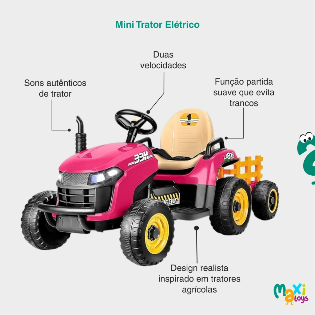 Carro Elétrico Trator Infantil 12v Com Controle Remoto e 2 Marchas Maxi Toys O Trator Elétrico Maxi Toys é o presente perfeito para transformar a brincadeira das crianças em uma verdadeira aventura. Inspirado nos tratores agrícolas, ele traz um design realista e sons autênticos de trator, criando uma experiência envolvente de faz-de-conta. Seguro e confortável, ele possui assento ergonômico ajustável em duas posições, cinto de segurança e apoios de braços protetores que garantem a segurança da criança, evitando quedas acidentais. Já a função de partida suave evita trancos ao acelerar ou frear, deixando os passeios ainda mais agradáveis. O trator pode ser controlado de duas formas: pelo modo manual, em que a criança escolhe entre duas velocidades, ou pelo controle remoto, que oferece três níveis de velocidade permitindo que os pais selecionem a velocidade desejada, além de botão de emergência (P) para parar o veículo imediatamente. Nesse modo, os pais sempre têm prioridade sobre os comandos, garantindo segurança total. Equipado com dois motores potentes de 45w, bateria recarregável e seis rodas robustas, o Mini Trator atinge de 4 a 5 km/h e circula facilmente por terrenos variados como grama, cascalho, asfalto ou até pisos de madeira. O diferencial dele é seu trailer destacável e basculante. As crianças podem transportar brinquedos, areia, folhas ou pequenos objetos, descarregando tudo com facilidade apenas inclinando o reboque. Com um simples toque, ele retorna automaticamente à posição inicial. Além disso, o trailer pode ser removido soltando apenas um parafuso, transformando o trator em um veículo compacto de quatro rodas, ideal para brincar em espaços menores e para facilitar o armazenamento. O painel multifuncional completa a experiência trazendo botão liga/desliga, botão de velocidade, visor de bateria, botão de volume e conexão bluetooth para os pais conectarem seus telefones celulares e reproduzir as músicas ou histórias favoritas de seus filhos. Indicado para crianças a partir de 3 anos, o Mini Trator Elétrico da Maxi Toys oferece interatividade, resistência e muita diversão, estimulando a imaginação, a coordenação motora e a independência dos pequenos. Principais Características: - ACOMPANHA FONTE/CARREGADOR BIVOLT - DURAÇÃO DE 1 A 2 APROXIMADAMENTE - Idade Recomendada: A partir de 3 anos até o peso maximo suportado - Peso Máximo Suportado: 30kgs - Bateria Recarregável 12V - Velocidade de 4 a 5 Km/h - Design Realista Inspirado em Tratores Agrícolas - Sons Autênticos de Trator - Câmbio Funcional (Frente, Ré e Parada) - Pedal de Aceleração - Faróis em LED - Assento Ergonômico Ajustável em 2 Posições (Ajuste Simples por 4 Parafusos) - Cinto de Segurança de 2 Pontos - Apoios Laterais de Braço e Pés - Função Partida Suave Evitando Trancos na Aceleração e Frenagem - Modo Manual: 2 Opções de Velocidade Para Crianças Dirigirem Sozinhas - Controle Remoto: 3 Níveis de Velocidade e Botão de Emergência (P) Para Parada Imediata - Necessário 2 Pilhas AAA (Não Inclusas) - Rodas Robustas e Resistentes ao Desgaste - Trailer Basculante Removível - Descarregamento Rápido Apenas Inclinando o Reboque - Retorno Automático à Posição Inicial com um Simples Toque - Painel Multifuncional com Visor de Carga da Bateria - Conexão Bluetooth Para Músicas e Histórias - Equipado com 2 Motores Potentes - Aprovado pelo Inmetro - Disponível nas cores: Verde, Amarelo, Rosa, Vermelho Especificações Técnicas - Conteúdo da Embalagem: 1 Mini Trator Elétrico com Trailer, 1 Controle Remoto, 1 Carregador + Manual de Instruções. - Composição/Material: Plástico - Alimentação Trator: Bateria Recarregável / Controle Remoto: 2 Pilhas AAA (Não Inclusas) - Dimensões do Produto Montado: (AxLxC): 60,0 x 59,0 x 135,0 cm - Peso: 13,500 kgs - Garantia: 90 dias (Contra defeito de fabricação pelo fabricante) - Certificação: Inmetro 010641/2023 - Código do Fabricante: 21890/ 21891/ 21892/ 21893 - EAN: 7899403218906/ 7899403218913/ 7899403218920/ 7899403218937 - Marca: Maxi Toys Imagens meramente ilustrativas. As cores e estampas podem variar de acordo com o lote do fabricante.