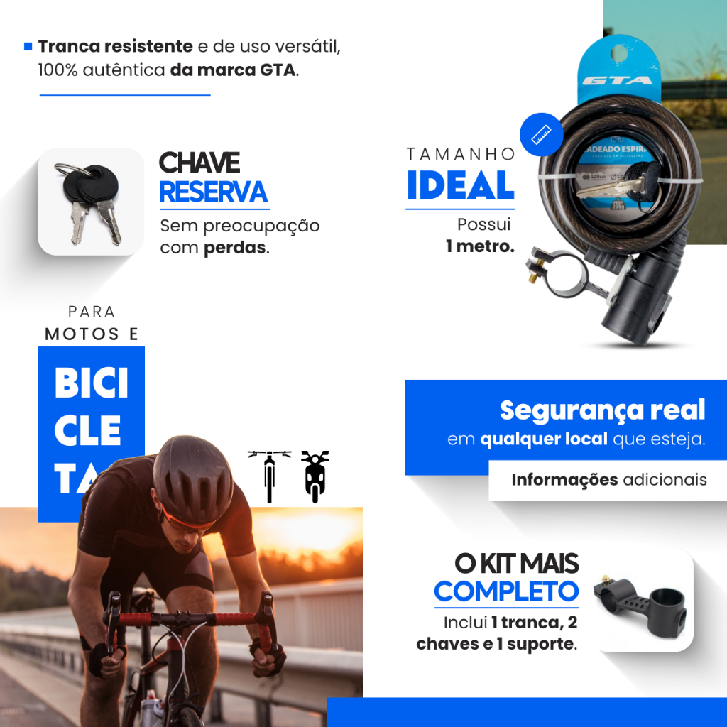 Trava de Segurança em Cabo de Aço Espiral com Cadeado e Suporte – Ideal para Bike e Moto Garanta a segurança de sua bicicleta, moto ou outros equipamentos com este trava de cabo de aço reforçado. Com um design espiralado e núcleo de bloqueio resistido, oferece resistência contra cortes e tentativas de arrombamento. - Alta Segurança: Feito de aço trançado resistente, revestido com PVC para maior durabilidade. - Praticidade e Facilidade de Uso: Sistema de bloqueio automático com chave, proporcionando mais segurança do que cadeados de código. - Versatilidade: Ideal para bicicletas, motos, patinetes, patins, equipamentos de ginástica, visibilidade e muito mais. - Fácil Transporte: Design compacto e acompanha suporte para fixação no quadro da bike. - Dimensões: 12x1000mm - Material: Aço + PVC + ABS - Envio imediato! Aproveite para garantir a segurança dos seus bens com qualidade e praticidade.