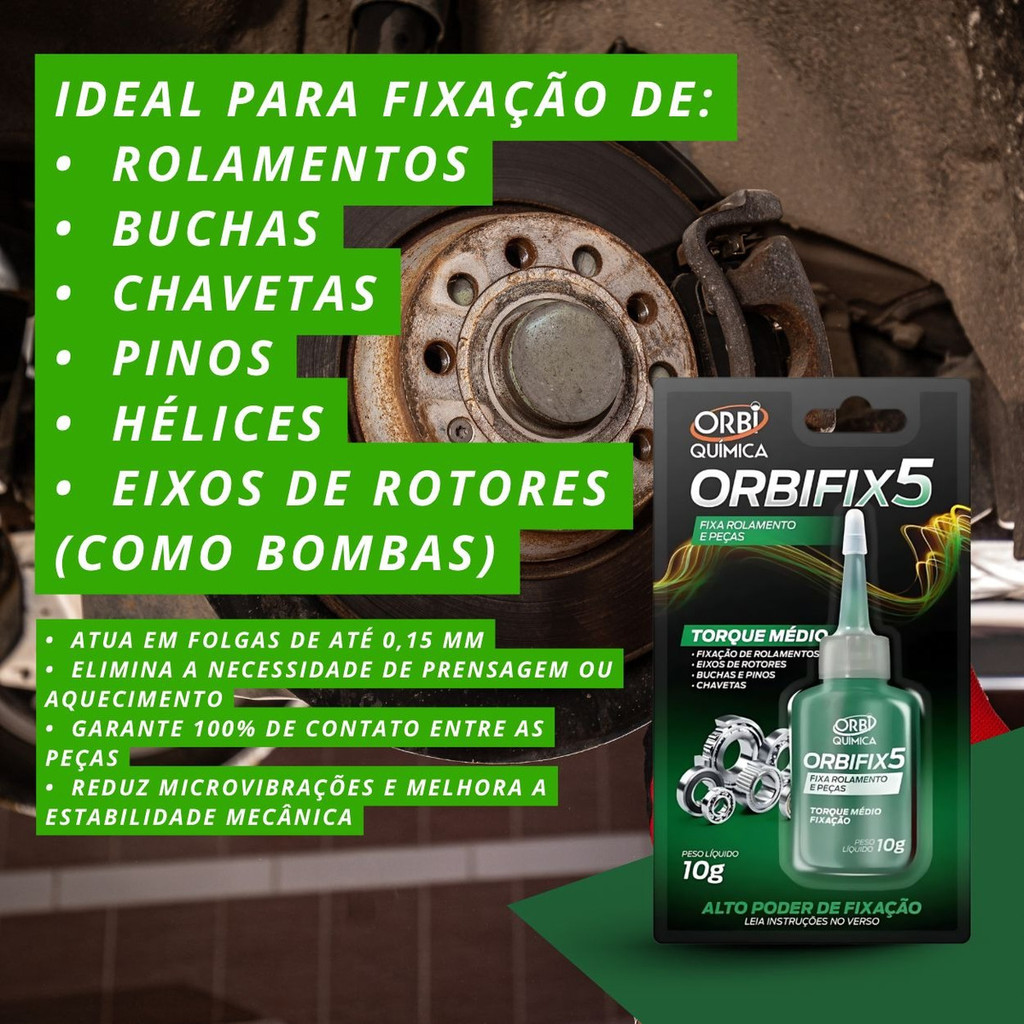 Orbifix Fixa Rolamento Verde 10g – Trava Química de Alta Resistência - Fixação e segurança para rolamentos e peças cilíndricas O Orbifix Fixa Rolamento Verde 10g é uma trava química anaeróbica de alta resistência, desenvolvida para fixar e vedar rolamentos, buchas, engrenagens e componentes cilíndricos. Garante máxima segurança, eliminando folgas, prevenindo vibrações e aumentando a vida útil das peças. Indicado para: - Fixação de rolamentos em eixos e carcaças - Montagem de buchas, engrenagens e polias - Componentes metálicos cilíndricos com folga mínima - Uso automotivo, industrial e mecânico em geral Benefícios: - Alta resistência mecânica contra vibrações e choques - Previne desgaste prematuro das peças - Substitui chavetas e pinos em algumas aplicações - Aumenta a durabilidade de rolamentos e montagens - Fácil aplicação e rápida cura Especificações: - Marca: Orbifix - Produto: Trava química fixa rolamento - Cor: Verde - Resistência: Alta - Conteúdo: 10g - Embalagem: Bisnaga de fácil aplicação Modo de uso: - Limpe bem a superfície, removendo óleos e sujeiras. - Aplique uma fina camada do produto sobre a peça. - Monte imediatamente e aguarde a cura completa. DÚVIDAS FREQUENTES: OS PRODUTOS SÃO NOVOS? Todos os produtos são novos. O PRODUTO ESTÁ DISPONÍVEL PARA ENTREGA? Sim. Todos os produtos anunciados constam em nosso estoque para pronta entrega. COMO FUNCIONA A GARANTIA? Esse PRODUTO possuem selo do Inmetro e garantia de 30 dias contra defeitos de fabricação. orbifix fixa rolamento, trava química verde, cola para rolamento, fixador anaeróbico, trava química alta resistência, adesivo para buchas e engrenagens. Sem garantia
