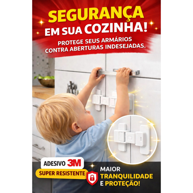 🔒 Trava de Segurança para Porta / Geladeira / Armário – Proteção Infantil Garanta mais segurança para sua casa e proteção para crianças e bebês com a trava de segurança multiuso. Ideal para impedir que os pequenos abram geladeiras, armários, gavetas e portas, evitando acidentes e bagunça. Fabricada com material resistente e adesivo de alta fixação, a instalação é simples e rápida, sem precisar furar móveis ou usar ferramentas. ✅ Principais Benefícios ✔ Segurança para crianças e bebês Evita que crianças abram portas, geladeiras e armários. ✔ Instalação fácil e rápida Não precisa furar nem usar ferramentas. ✔ Adesivo super resistente Alta fixação para manter portas e móveis sempre fechados. ✔ Design discreto e moderno Combina facilmente com qualquer ambiente da casa. ✔ Produto multiuso Pode ser usado em vários lugares. 📌 Pode ser usado em: Geladeira Armários Gavetas Portas Freezer Micro-ondas Caixa de ferramentas Móveis em geral 📦 Conteúdo da Embalagem • Trava de segurança adesiva (Quantidade conforme o kit escolhido) 🛠️ Instalação 1️⃣ Limpe a superfície antes da aplicação 2️⃣ Remova a proteção do adesivo 3️⃣ Cole a trava no local desejado 4️⃣ Pressione por alguns segundos para melhor fixação 🔐 Mais tranquilidade para sua família Com essa trava de segurança, você protege sua casa e evita que crianças tenham acesso a locais perigosos. 💡 Solução simples, prática e eficiente para o dia a dia.