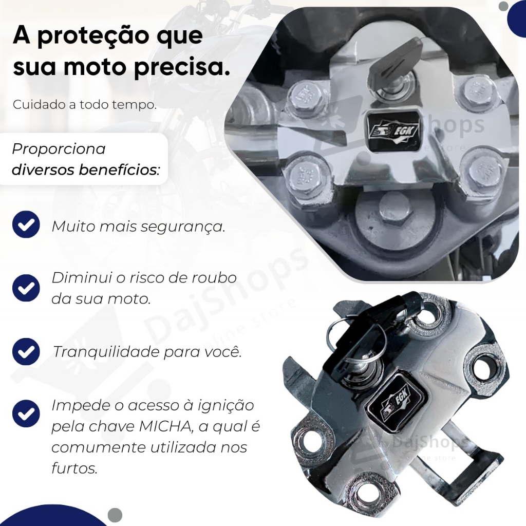Trava Do Miolo Antifurto Ignição Moto Titan 160 150 Fan Start *** ENVIO IMEDIATO!!!*** ***COM NOTA FISCAL*** Desenvolvida para Titans a partir de 2014, incluindo Titan 160, Fan 160, Start 160, e Cargo 160, esta trava oferece segurança robusta. Seu design sofisticado em alumínio não apenas aumenta a resistência, mas também acrescenta um toque de elegância à sua moto. Com duas chaves inclusas, tenha a tranquilidade de saber que sua moto está protegida com estilo. ----------------------------------------------------------------------------------------------------------- Motos Compatíveis: Honda Cg Titan 150 ano 2014 em diante Honda Cg Titan 125 ano 2014 em diante Titan 160 Fan 160 Start 160 Cargo 160 ----------------------------------------------------------------------------------------------------------- Conteúdo da Embalagem: 01- Trava Antifurto Bloqueio de Ignição (EGK) 02- Chaves ----------------------------------------------------------------------------------------------------------- Material: alumínio ----------------------------------------------------------------------------------------------------------- Cor : Cromado Preta ----------------------------------------------------------------------------------------------------------- Importante: Sempre lubrifique o miolo para melhor conservação Trava de miolo antifurto : Tem a missão de proteger sua moto do famoso roubo na chave mixa ! ----------------------------------------------------------------------------------------------------------- << Quem é a DajShops, como Nascemos >> A DAJSHOPS é o lugar perfeito para encontrá-lo! Nossa empresa 100% digital foi fundada por um casal de apaixonados ambiciosos que queriam criar seu próprio negócio e algo especial para nossos clientes. Oferecemos produtos de primeira linha, juntamente com uma experiência de compra inesquecível. Além disso, nossas avaliações de clientes são 4,9/5 em todas as análises, tornando-nos a melhor escolha para suas necessidades de compras. Junte-se a milhares de clientes satisfeitos hoje e experimente comprar na DAJSHOPS você mesmo SEJAM BEM VINDOS