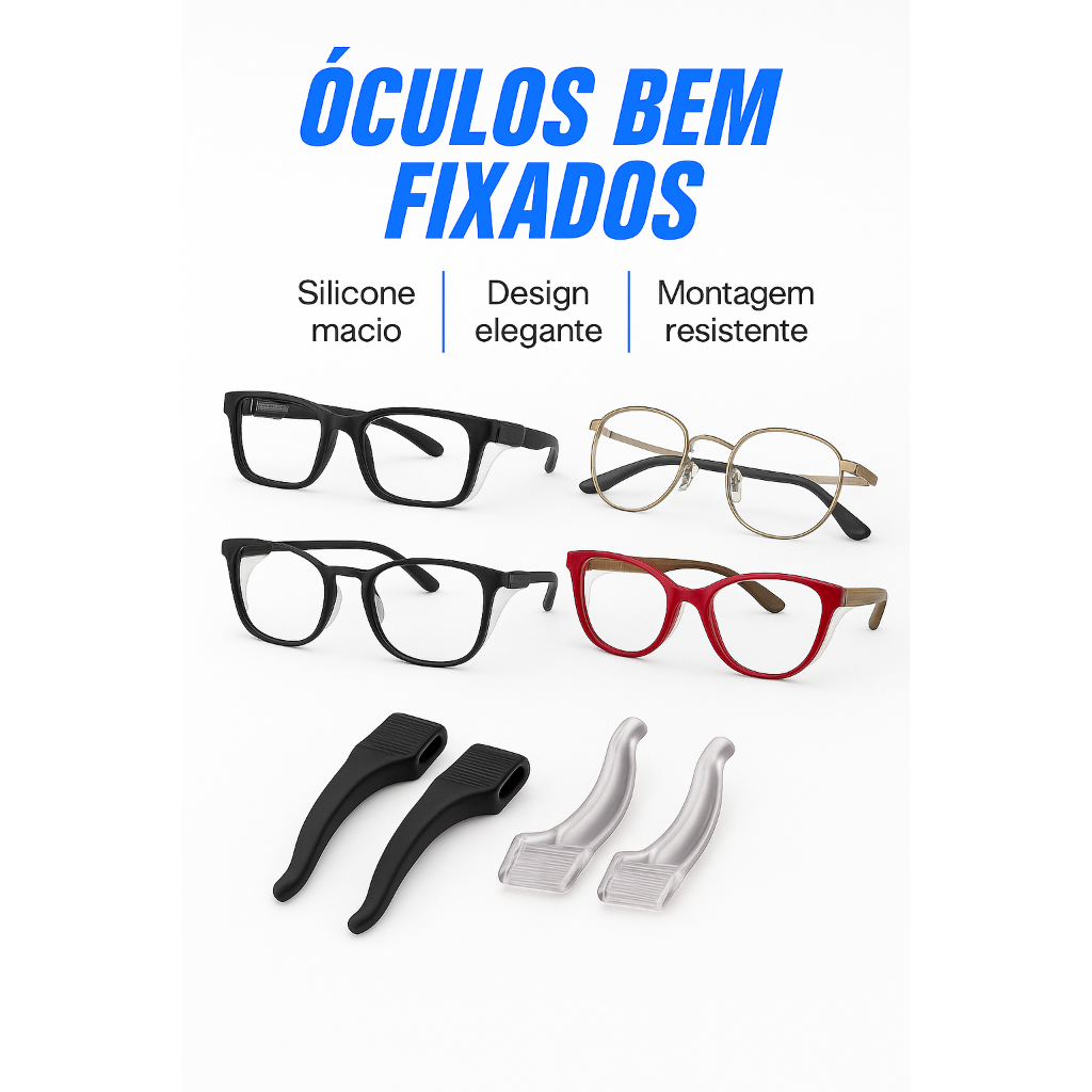 Produto auxiliar para melhorar a estabilidade dos óculos durante o uso diário ou atividades físicas leves. Fabricadas em silicone macio e flexível, as travas ajudam a reduzir o deslizamento da armação atrás da orelha, trazendo mais conforto no dia a dia. Compatível com a maioria das hastes de óculos de grau e óculos de sol. Especificações: Material: Silicone Toque: Macio e flexível Formato: Anatômico Peso: Leve Instalação: Encaixe simples Conteúdo da embalagem (conforme variação escolhida): 1 par = 2 unidades 2 pares = 4 unidades 3 pares = 6 unidades Indicado para: Uso diário Atividades como caminhada, academia e ciclismo leve Óculos de grau ou solares Quem busca mais conforto ao usar óculos por longos períodos Modo de uso: 1. Encaixe a trava na haste do óculos 2. Posicione atrás da orelha 3. Ajuste conforme seu conforto Observações importantes: Produto de apoio — o resultado pode variar conforme o formato da haste e da orelha. Não substitui ajuste profissional da armação. Não garante fixação total.