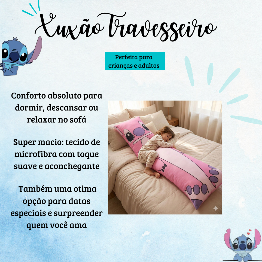 Seja Bem-vindo(a) à Loja Gut Gut Confecções! Xuxão Travesseiro ideal para quem busca conforto, aconchego e praticidade no dia a dia. Perfeito para dormir abraçado, relaxar no sofá ou apoiar o corpo durante o descanso. Medidas: • Comprimento: 1,45 m • Largura: 40 cm Tecido: • Microfibra estampada • Toque super macio e aconchegante Enchimento: • Fibra siliconada antialérgica • Enchimento solto dentro da fronha, garantindo mais maciez e conforto • Não possui refil separado Produto lavável, com zíper para facilitar a higienização. Indicado para crianças e adultos, resistente para uso diário e uma excelente opção para presentear.