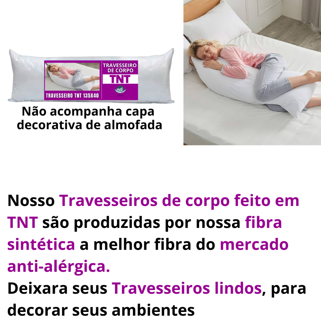 Acompanha: 2 travesseiros de corpo TNT Todos nós precisamos de um sono tranquilo. Nada melhor que um travesseiro para abraçar. O Body Pillow é um travesseiro para o corpo que ajuda a manter a postura correta principalmente para quem dorme de lado. Seu revestimento em percal e o recheio em fibra siliconizada hiper fina e extra macia trazem uma deliciosa sensação de conforto. Pode servir de proteção para crianças e é muito confortável para gestantes. Com recheio de fibra siliconizada, também pode ser usado como decoração na cabeceira da cama durante o dia. Obs.: As cores podem sofrer variações de acordo com o tipo, configuração e resolução do seu monitor. A medida do produto pode variar até 2cm (para maior ou para menor devido seu corte ser feito no sistema de enfesto). INFORMAÇÕES IMPORTANTES: - Produto lavável em máquina (Siga as instruções da etiqueta). - Secagem acelerada. - Antialérgico e antiácaro. - Possui proteção contra os raios UVs. - Superfície Macia. - Excelente custo e benefício. - De fácil manutenção. Restou alguma dúvida? Utilize o campo de perguntas. TERMOS RELACIONADOS Cama Quarto Colcha Jogo de Lençol Travesseiro Pillow Top