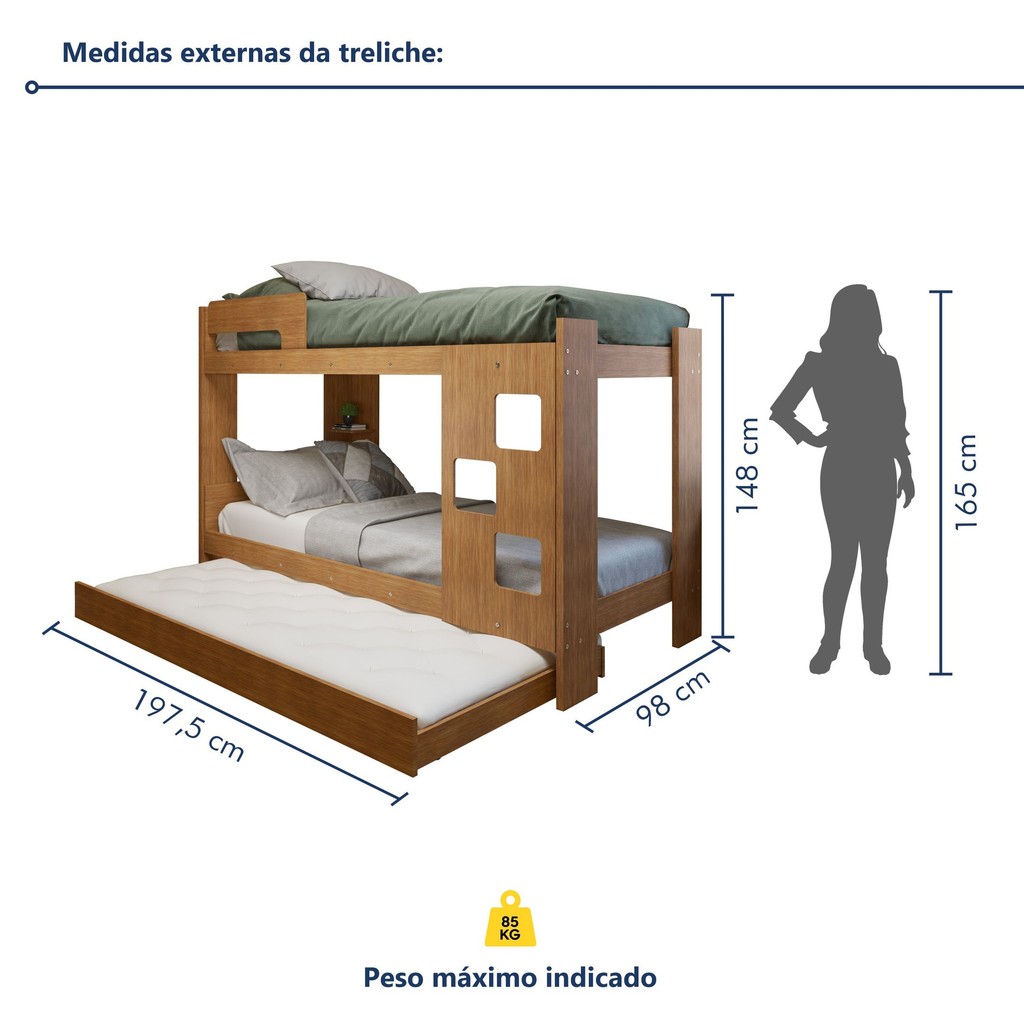Treliche 100% MDF com Prateleira Vegas A Treliche Vegas 100% MDF é a escolha ideal para quem precisa otimizar o espaço no quarto das crianças ou em ambientes compartilhados. Com prateleira integrada, oferece um armazenamento adicional para livros, brinquedos e outros itens. O design funcional e moderno garante segurança e conforto, sendo perfeita para quartos com mais de uma cama. A treliche é segura para crianças? Sim, ela é projetada para oferecer segurança e estabilidade durante o uso. As prateleiras podem ser usadas para armazenar brinquedos? Sim, as prateleiras são ideais para organizar brinquedos e outros itens. Estilo: Moderno Peso (kg): 78.6 Garantia: 03 Meses Altura (cm): 148 Acabamento: Pintura UV Largura (cm): 197.5 Possui Pés: Não Possui Portas: Não Comprimento (cm): 98 Possui Gavetas: Não Possui Rodízio: Sim Suporta Até (kg): 85 Tipo de Estrado: Fixo Escala de Brilho: Semi-Brilho Acompanha Colchão: Não Origem do Produto: Nacional Rodízio com Trava: Não Ambiente Principal: Quarto Infantil Material da Escada: MDF Possui Prateleiras: Sim Material do Estrado: MDF Possui Escrivaninha: Não Material da Prateleira: MDF Acompanha Cama Auxiliar: Sim Acabamento da Prateleira: Pintura Cama Auxiliar com Rodízio: Sim Possui Trava de Segurança: Não Peso Máximo por Prateleira: 10 Tamanho do Colchão (LxC): 088×188 Solteiro Padrão Altura do Estrado até o Chão: 32 Cama Auxiliar Suporta Até (kg): 85 Peso Suportado por cada Cama: 85 Escala de Brilho da Prateleira: Semi-Brilho Cama Auxiliar Acompanha Colchão: Não Informações Complementares (Novo): Treliche equipada com cantoneira para celular, proteção lateral na cama superior. Sua escada é projetada na frente para facilitar o acesso à cama superior quando montada em ambiente apertado, pés e barras em MDF de 25mm dando total resistência e segurança Altura do Estrado Superior até o Chão: 125 Permite a Utilização de Cama Auxiliar: Sim Marca: Tigus Baby Cor: Ypê Cor do Produto: Ypê Itens Inclusos: 1 Treliche e manual de montagem. Cor Predominante: Marrom Linha ou Coleção: Vegas Tamanho do Colchão Indicado (L x C): 188cmx88cm Tamanho do Colchão Indicado Cama Auxiliar (L x C): 88 x 188 (cm)