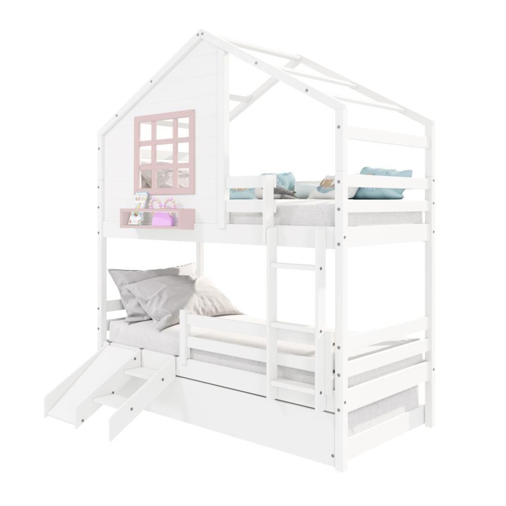Treliche Casinha Com Janela Com Escada/ Escorregador E Grade De Proteção Madeira Maciça Branco/ Rosa Housin DETALHES Acabamento: Branco/ Rosa PU (pode mostrar veios da madeira) Estrutura: Madeira Maciça de Pinus de Reflorestamento Medidas dos Colchões da Cama de Solteiro (cm x cm): 88x188 (Não Incluso) Medidas do Colchão da Cama Auxiliar (cm x cm): 88x188 e Altura Máxima 14 (Não Incluso) Peso Suportado Cama de Solteiro: 120 Kg Peso Suportado Cama de Auxiliar: 120 Kg Diferenciais: Escada Fixa, Auxiliar com 4 Rodízios, Kit Escada/ Escorregador, Grade de Proteção Removível, Casinha com fechamento em MDF, Janela e Prateleira para Livros e Decoração, Montagem Reversível (Lado Direito ou Lado Esquerdo) DIMENSÕES DO BELICHE MONTADO Altura (cm):230 Largura (cm):199,4 Profundidade (cm):96,6 DIMENSÕES DA CAMA AUXILIAR Largura (cm):189 Altura (cm):26 Profundidade (cm):94 INFORMAÇÕES COMPLEMENTARES Garantia do Fabricante: Prazo de 3 meses por defeito de fabricação Necessita de Montagem: SIM (Acompanha manual de montagem) Atenção: Não realizamos serviço de montagem e instalação. Imagens meramente ilustrativas. Cores e tonalidades podem variar. EMBALAGEM Peso (KG):91 Quantidade de Volumes:06 Material Principal: Madeira Maciça | Cor: Branco | Necessita Montagem: Sim | Acompanha Colchão: Não | Tipo de Cama: Treliche