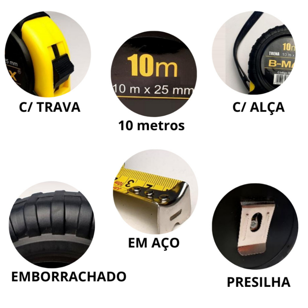 | 5M/10 MetrosTrena Profissional Fita Métrica Fluorescente Com Trava | R$ 29,99 | — | 4.9/5 | 52 |