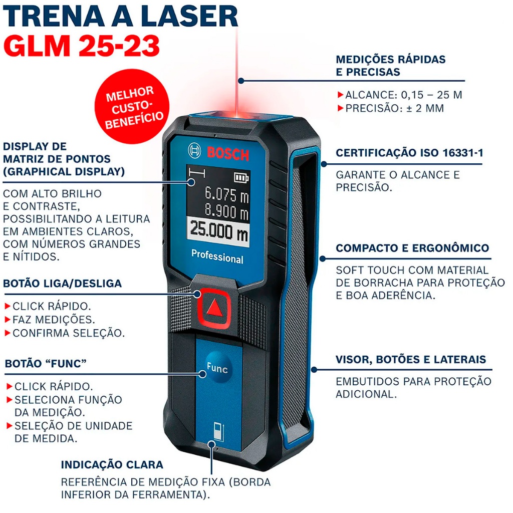 Distribuído por Ismafer Ferramentas Trena Laser Bosch GLM 25-23 + Bolsa A trena laser GLM 25-23 da Bosch é a primeira trena que faz cálculos. Faça medições e calcule metros com total facilidade em poucos segundos. Conta com usabilidade conveniente com interface intuitiva e tamanho compacto para facilitar o dia a dia de trabalho. Pode ser usada em diferentes necessidades de medição como medir alturas e distâncias, área do chão e paredes para orçamentos e serviços. Conta com design atraente com material de borracha para melhor proteção e aderência, além de tela com melhor legibilidade dos dados. Características: - Mede distâncias com precisão e realiza cálculos de áreas - Usabilidade conveniente com interface intuitiva - Tamanho compacto para facilitar o manuseio no dia a dia - Adequado para diversas necessidades de medição, como alturas e distâncias, área do chão e paredes - Design atraente com material de borracha para proteção e aderência - Tela de fácil leitura dos dados Informações técnicas: - Não acompanha maleta - Fonte de Energia: 2 pilhas AAA - Não compatível com bateria Bosch - Não necessita baterias - Necessita pilhas Itens inclusos: - 1 Medidor de 30 m Bosch GLM 30-23 - 1 Manual de instrução - 2 pilhas AAA Garantia: 24 meses pelo fabricante + A Bolsa de transporte para Furadeira/Parafusadeira da Bosch, é a melhor solução para locomoção de suas ferramentas, feita em tecido de nylon de maior resistência, alça para melhor manuseio ela pode comportar a sua Furadeira/Parafusadeira e o acessórios com segurança. Características: - Divisória Interna tipo rede. - Elástico para acomodar ferramentas acessórios. - Resistente a impacto. - Alça de transporte. - Zíper de fácil abertura. Marca: Bosch Modelo: 1600A003BG Dimensões(A x L x C): 23 x 8 x 31cm SKU: 24623 Distribuído por Ismafer Ferramentas