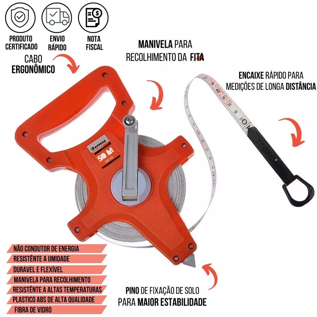 DESCRIÇÃO: Fita métrica de fibra de Vidro 50 metros, escala em milímetros centímetros e metros. Uso domestico e profissional, ideal para medir grandes áreas terrenos e casas, ótima qualidade, possui manivela que auxilia recolhimento da fita, Resistente a umidade e Temperatura, possui clipe na ponta. Largura da Fita 14 mm. Produto disponível em estoque a pronta entrega. Peça já a sua. DESCRIÇÃO DO PRODUTO: - Material: ABS, PVC, Aço e Fibra de Vidro. - Escala: mm cm metros. - Não condutor de eletricidade. - Cabo ergonômico. - Manivela para recolhimento. - Uso doméstico e Profissional. - Resistente à umidade e temperatura. - Garantia: Indeterminada Itens Inclusos: 1 Trena Modelo: Fibra de Vidro 50 metros