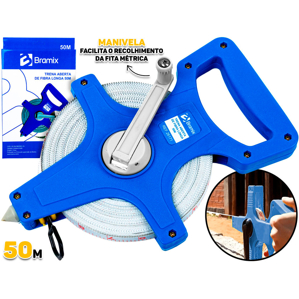 Trena De Medição Longa Aberta De Fibra 50 M Bramix P/ Construção Topografia Uso Domestico Alta Resistência