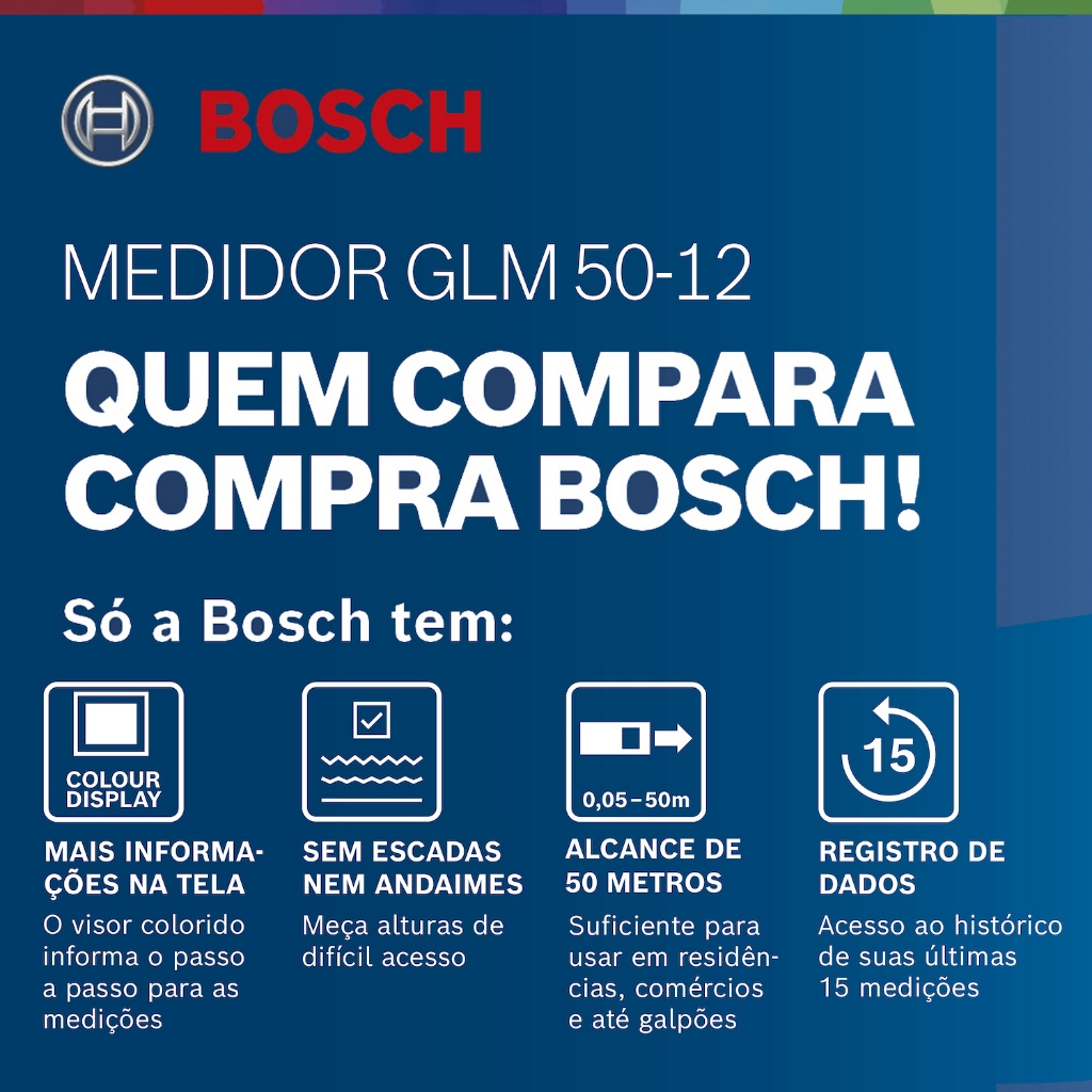 Trena laser GLM 50-12 alcance 50m Bosch Vantagens: - A trena laser Bosch GLM 50-12 é ideal para medição de distâncias e alturas de até 50 metros de distância; - Meça com um clique de forma contínua conforme o medidor é movimentado e calcule área, volume e altura indireta; - Sua tela colorida super intuitiva calcula tudo com facilidade; - O visor te informa o passo-a-passo para medir; - Acesse o histórico de suas últimas 15 medições; - É ideal para medição em locais de difícil acesso, pois permite medir sem precisar utilizar escadas nem andaimes, evitando acidentes; - Possui proteção contra poeira e respingo de água (IP 54), para aumentar a durabilidade do equipamento; - Possui botão de conversão dedicado para troca imediata da unidade com uma única pressão; - Interface homem-máquina (IHM) de fácil utilização para seleção rápida de funções de medição; - Os cálculos são confiáveis e precisos, evitando erros na hora de passar orçamentos; - Praticidade: faça orçamentos sem precisar de ajudante; - Muito mais profissionalismo: seu trabalho com absoluta precisão; - Uso com 24 meses de garantia Bosch. Aplicações: - Medição de distâncias: você só precisa apontar o laser para o local que deseja medir e pressionar o botão; - Medição contínua: veja o resultado aparecendo na tela em tempo real conforme move o medidor; - Medição de área: meça a largura e o comprimento e o medidor calcula na hora quantos metros quadrados tem o local; - Medição de volume: meça a largura, o comprimento, a altura e o medidor calcula na hora quantos metros cúbicos tem o ambiente; - Medição de altura indireta: calcule facilmente a altura até mesmo de locais que não têm um teto como anteparo. Características: - Modelo: GLM 50-12; - Referência: 0601072RG0; - Cor: Azul/Preto; - Tipo de embalagem: Caixa de papelão; - Acabamento da ferramenta: Borracha, plástico e vidro; - NÃO possui conexão bluetooth; - Possui desligamento automático: 5 min; - Entrada para tripé 1/4; - Ambiente de uso: Interno; - Público alvo: Orçamentistas (exemplos marceneiros, pintores, pedreiros, etc.), instaladores em geral, engenheiros, arquitetos, profissionais de construção em geral; - Fonte de energia: 2 pilhas AAA (inclusas); - Composição da célula da pilha: Alcalina. Dados Técnicos: - Díodo laser: 635 nm, < 1 mW; - Faixa de medição: 0,05 – 50,00 m; - Unidades de medição: m/cm; - Tempo de medição, típico: < 0,5 s; - Classe de laser: 2; - Precisão de medição, típica: ± 1,5 mm* (*mais divergência dependente do uso); - Tempo de medição máx.: 4 s; - Cor laser: Vermelho; - Faixa de medição, até: 50 m; - Dimensões da embalagem (AxLxP): 7,3x12,9x15,8 cm; - Peso: 0,100 Kg. Componentes incluídos na embalagem: - 1 Trena Laser de 50 m Bosch GLM 50-12; - 1 bolsa de proteção; - 2 pilhas AAA; - 1 Certificado do fabricante; - 1 Manual de instruções.