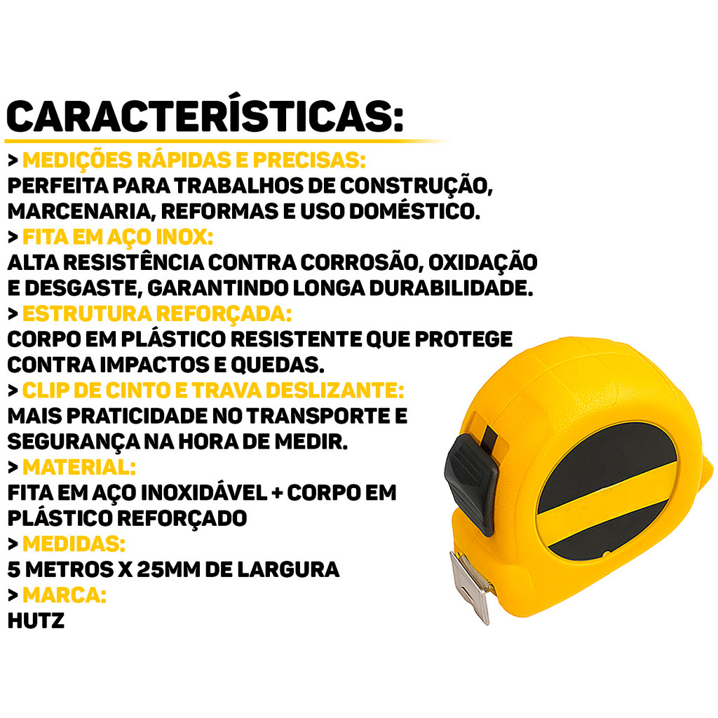 Trena Hutz A Trena Hutz é a ferramenta ideal para profissionais que buscam um produto de qualidade. Desenvolvida com material resistente, possui design ergonômico, oferecendo medições precisas e manuseio confortável para qualquer tipo de trabalho. Características: > Excelente leitura; > Fácil de travar e destravar; > Fita produzida em aço inox; > Corpo produzido em plástico; > Compacta, leve e fácil de transportar; > Alta durabilidade e resistência ao desgaste; > A fita possui 5 metros de comprimento e 25mm de largura. Especificações Técnicas: > Material: aço inox e plástico; > Dimensões do produto (C x L x A): 7cm x 7cm x 2,9cm. - Marca: Hutz - Garantia: 90 dias contra defeitos de fabricação Vantagens de comprar na Brester: - Produto a pronta entrega. - Produto novo, com garantia de fábrica. - Nota fiscal para Pessoa Física e Pessoa Jurídica.