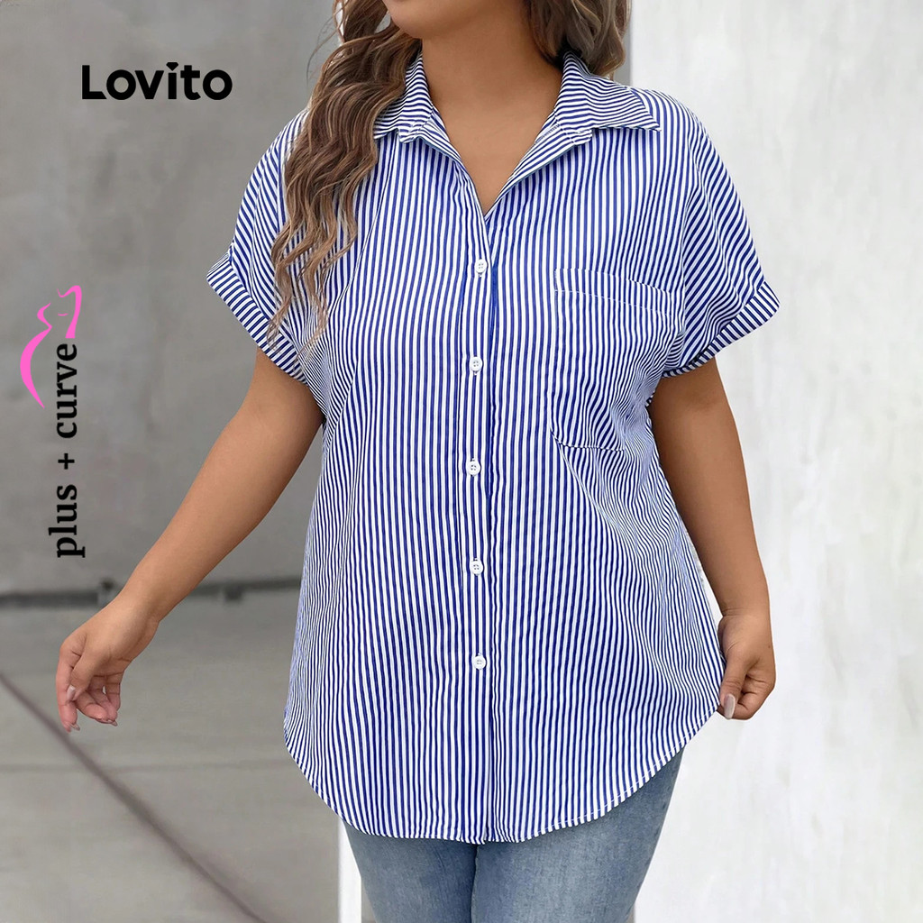 (Trendy) Lovito Blusa Básica Plus Size Curva Casual Listrada Com Botões Para Mulheres LBL24587