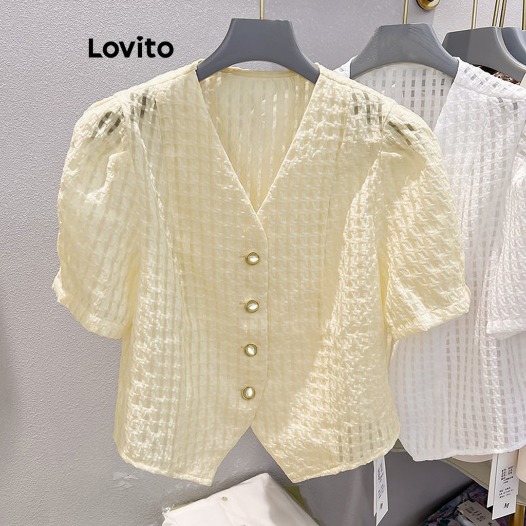 (Trendy) Lovito Blusa Casual Blusa Lisa Com Botões Para Mulheres LNL37095 (Multicolorido)