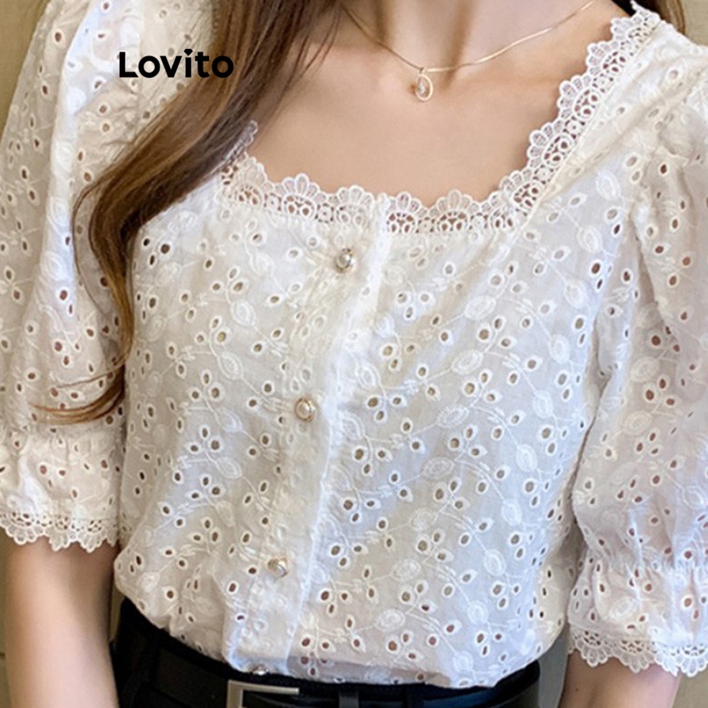 (Trendy) Lovito Blusa Casual Contraste Blusas De Renda Para Mulheres LNE16069 (Branco)