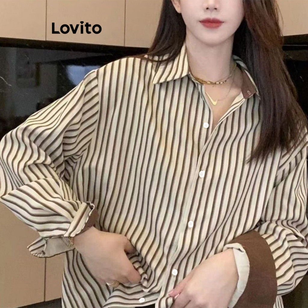 (Trendy) Lovito Blusa Casual Listrada Colorblock Para Mulheres LNE27252 (Marrom)