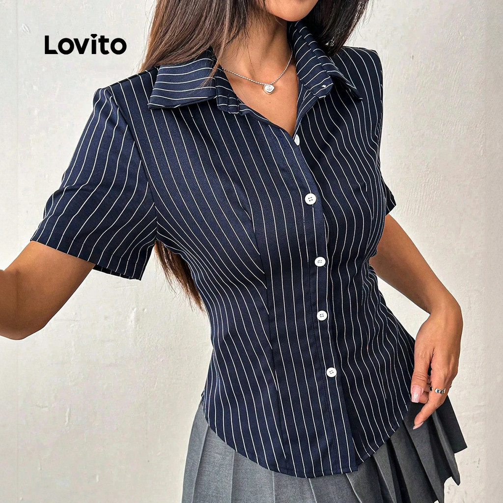 (Trendy) Lovito Blusa elegante listrada com botão frontal redondo para mulheres LBL23387