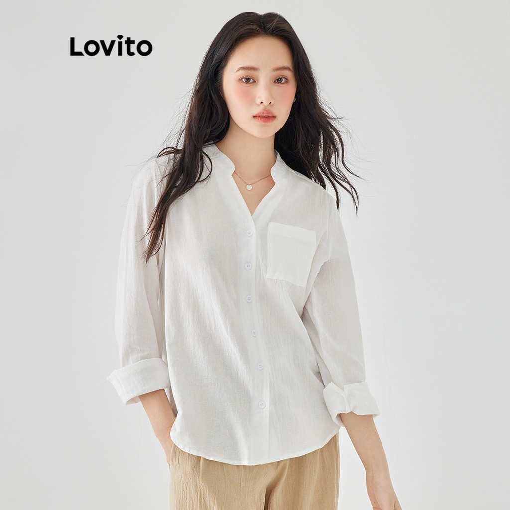 (Trendy) Lovito Blusas de Manga Longa com Bolsos e Botões na Frente para Mulheres LEX01059 (Multicolorido)