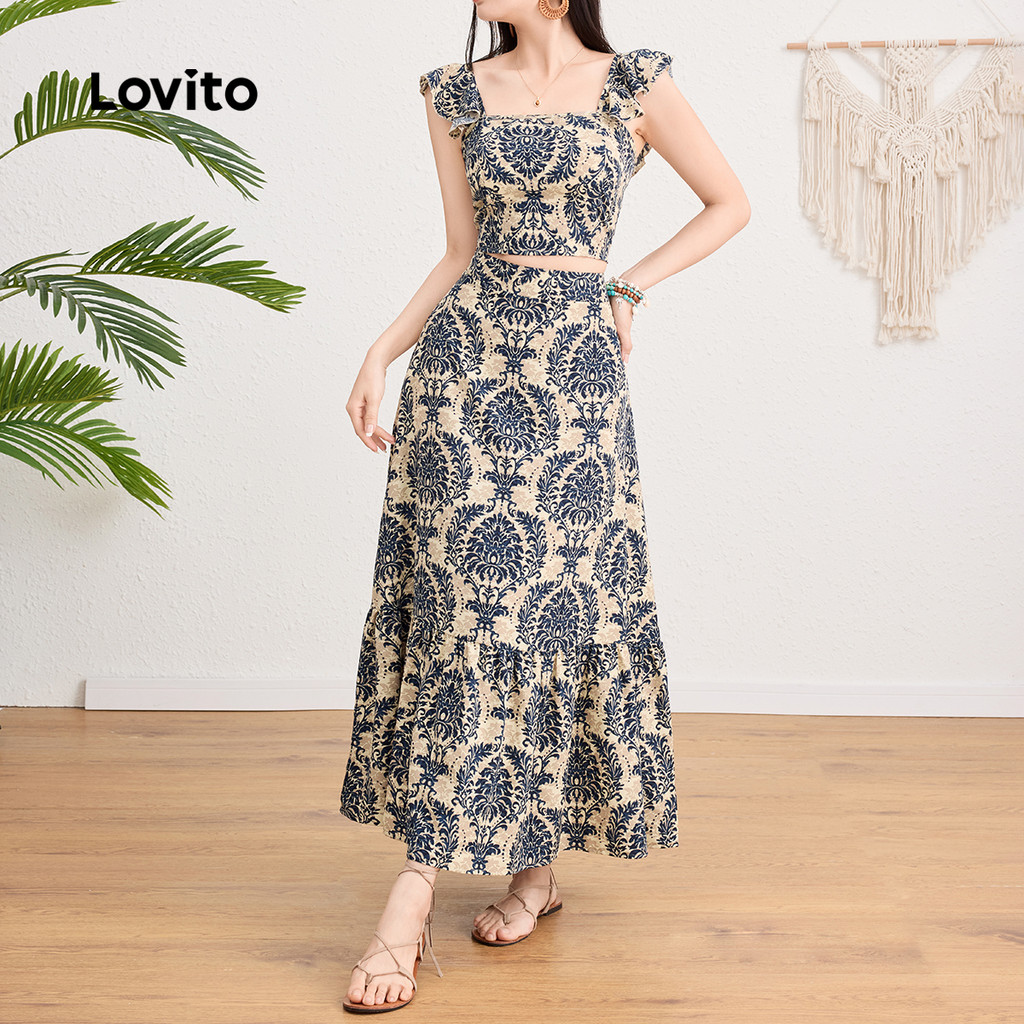(Trendy) Lovito Boho Tops Ou Bottoms Tribal Print Ruffle Hem Zipper Padrão Conjuntos De Saia Para Mulheres L124AD1139