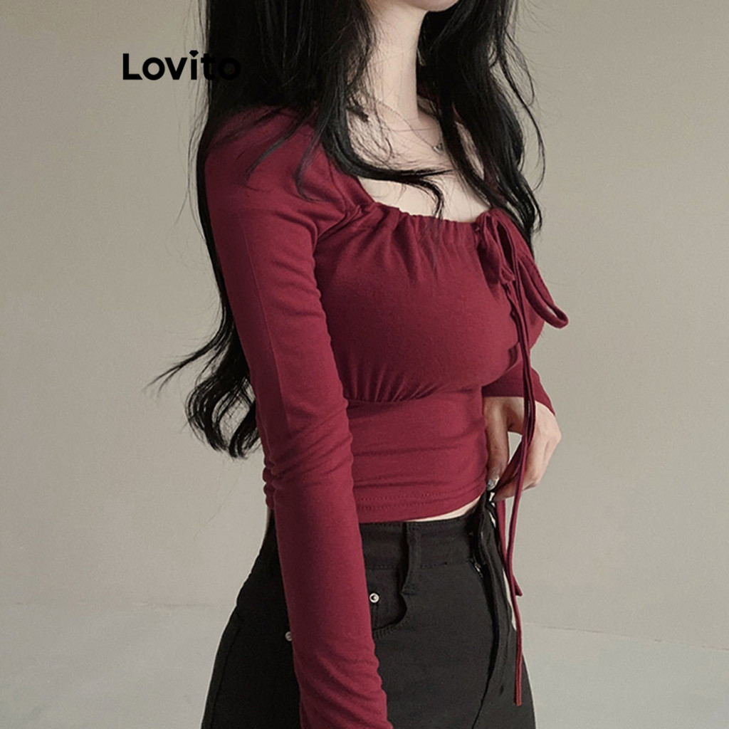 (Trendy) Lovito Camiseta Casual Com Gravata Lisa Frontal Franzida Plissada Para Mulheres L106AD941