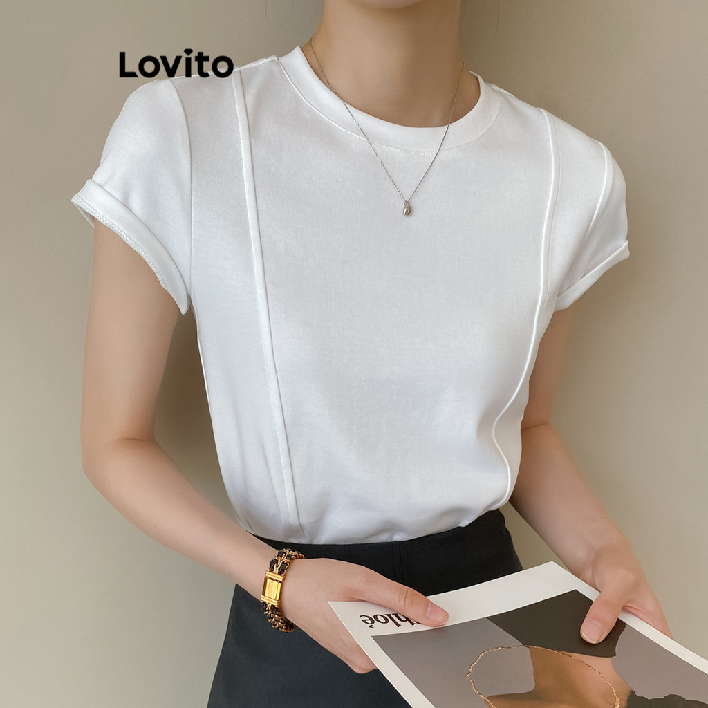 (Trendy) Lovito Camiseta Casual Linha De Estrutura Lisa Camiseta Básica Para Mulheres L100MD264
