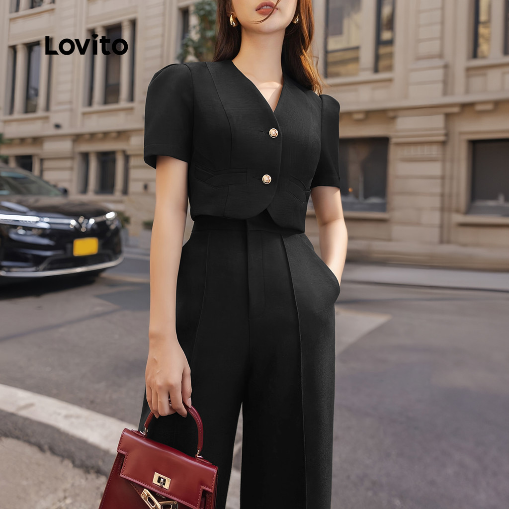 (Trendy) Lovito Conjuntos elegantes de calças com zíper e botão liso para mulheres L129ED323