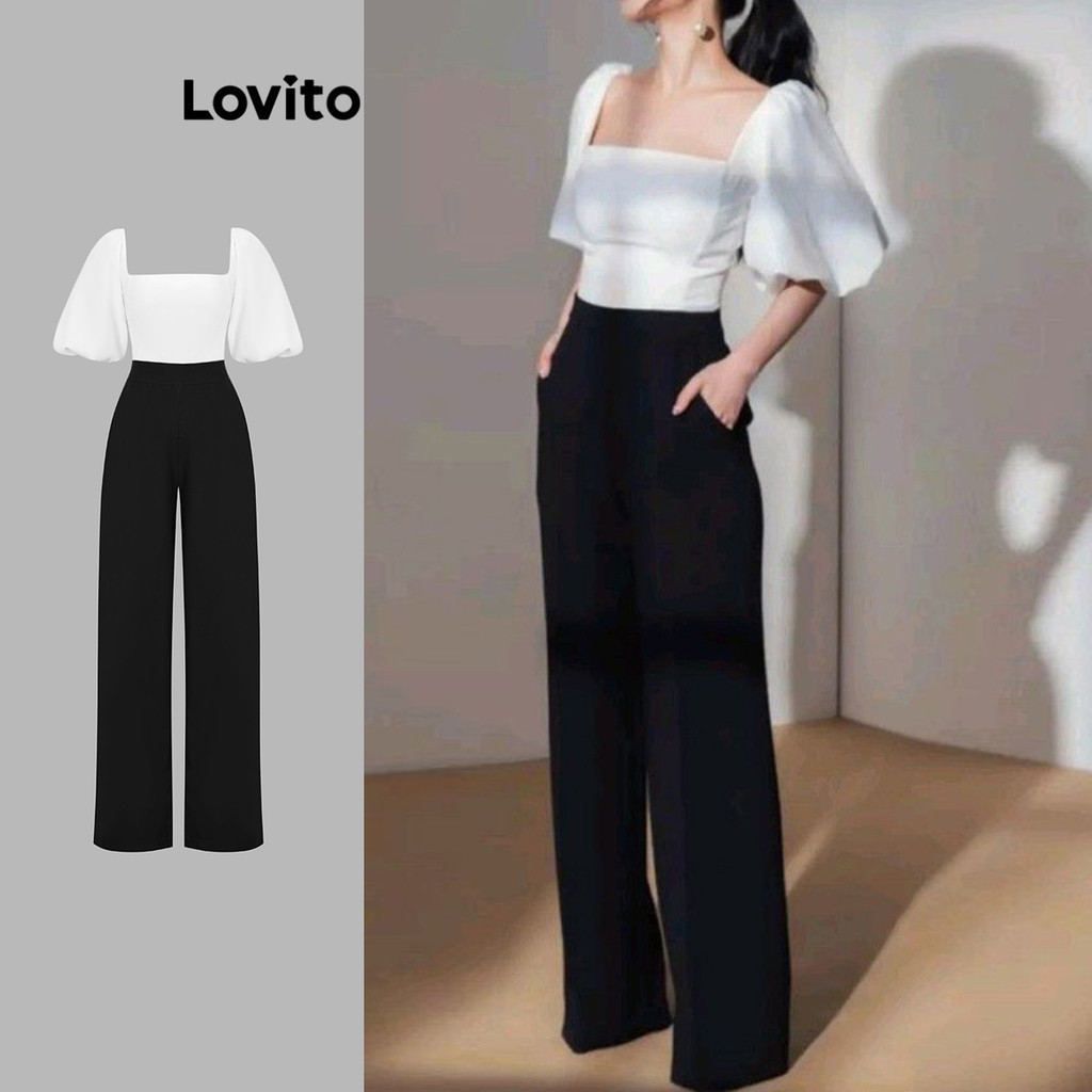(Trendy) Lovito Macacão Casual Colorblock Drapeado Verão/Primavera Para Mulheres L110AD1310