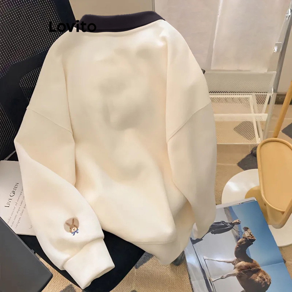 (Trendy) Lovito Moletom Casual Bordado Animal Padrão Moletom Com Gola Contrastante Para Mulheres LNE39360 (damasco)