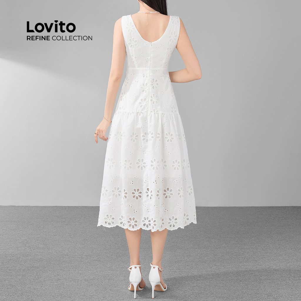 (Trendy) (Lovito Refine) Vestido Casual Floral Com Ilhós Bordados E Babados Na Bainha Branca Para Mulheres LR11ED070