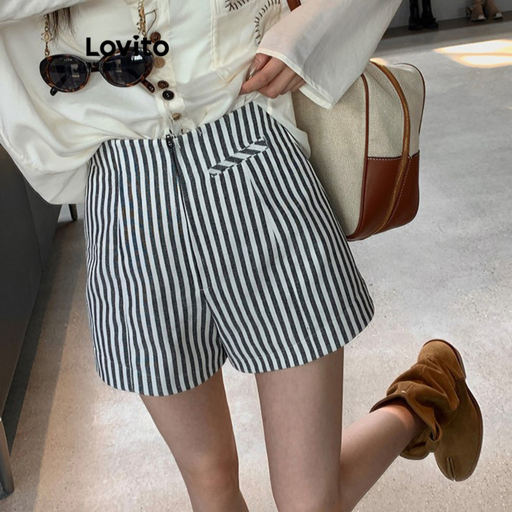 (Trendy) Lovito Shorts Casuais Listrados Com Bolso Falso Para Mulheres L113MD320