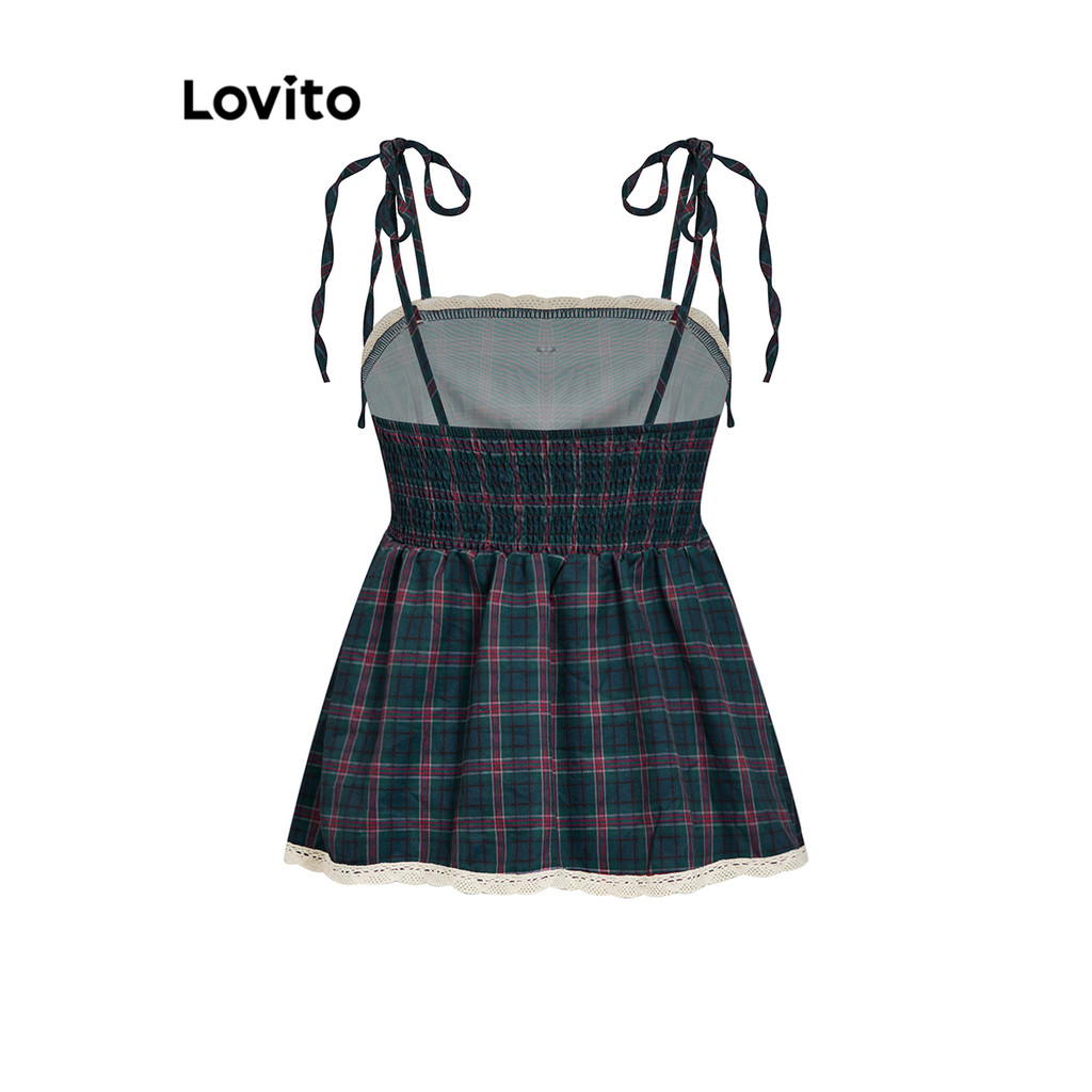 (Trendy) Lovito Top Casual Xadrez Com Babados E Gola Com Cadarço E Botão Regata De Verão Para Mulheres L104ED086
