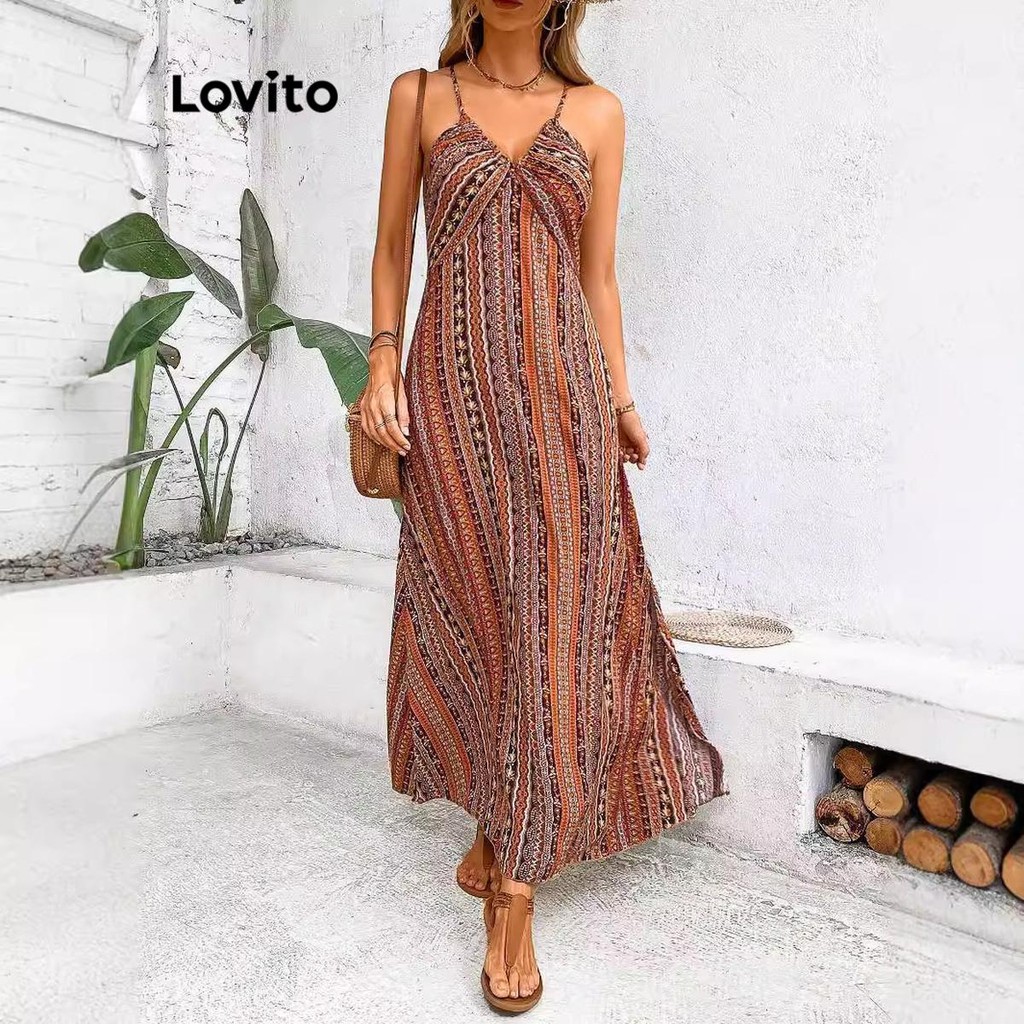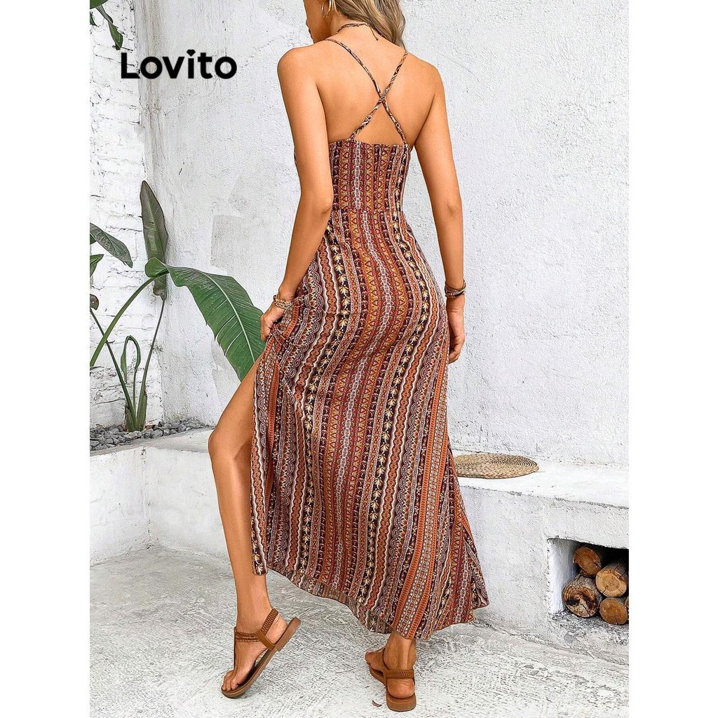 (Trendy) Lovito Vestido Boho Criss Cross Split Frente Vestido Para Mulheres LNL73018