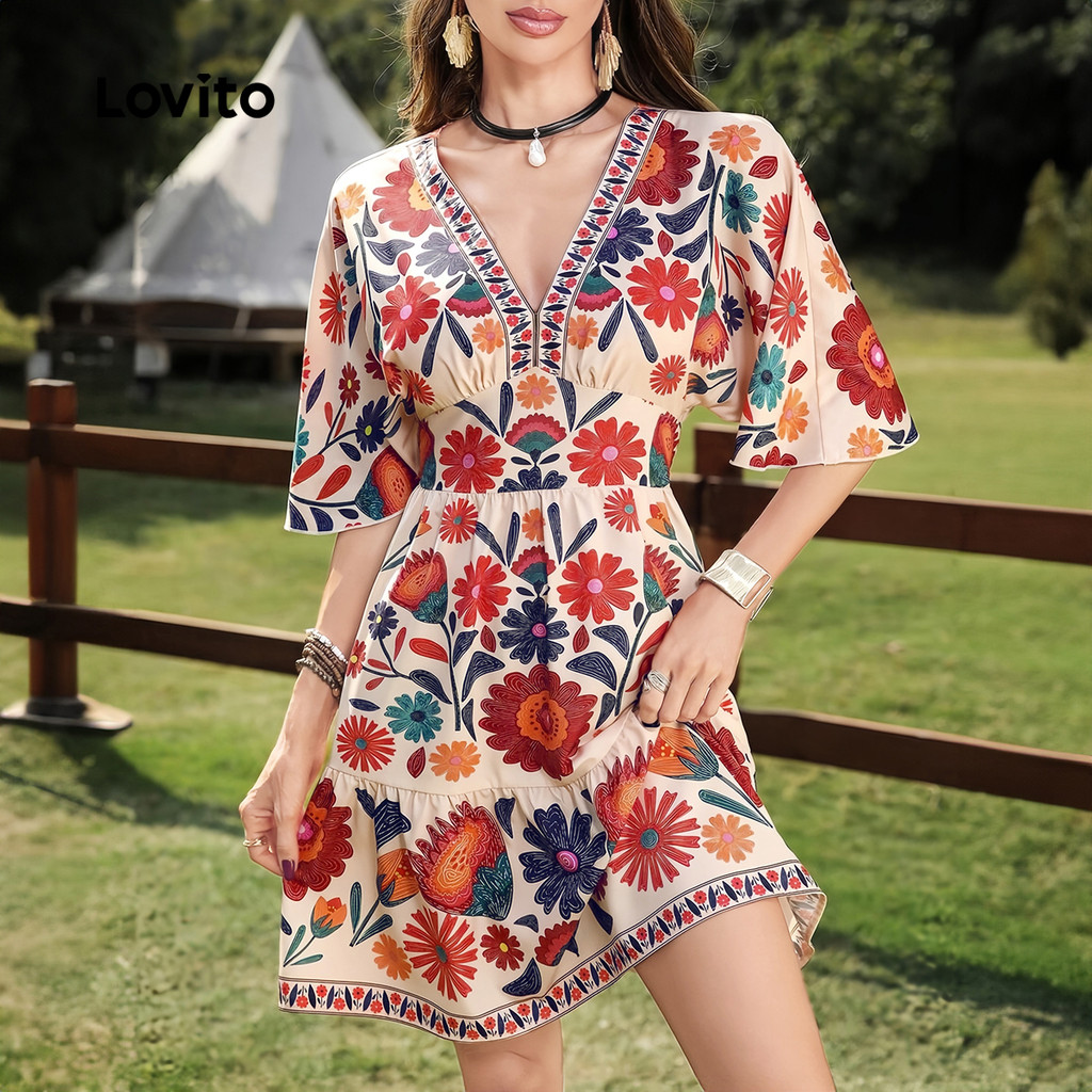 (Trendy) Lovito Vestido Boho Padrão Vestido Multicolor Primavera/Verão Para Mulheres L135ED250