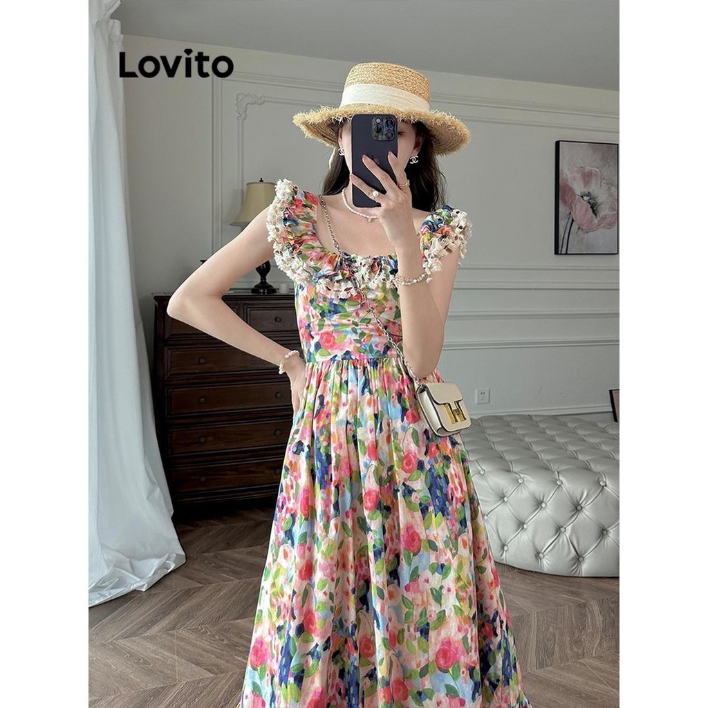 (Trendy) Lovito Vestido Casual Ditsy Floral Franzido Com Babados Para Mulheres LNA53103