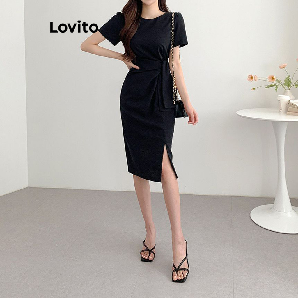 (Trendy) Lovito Vestido Casual Liso Com Nó Frontal Dividido Para Mulheres L80ED307 (Multicolorido)