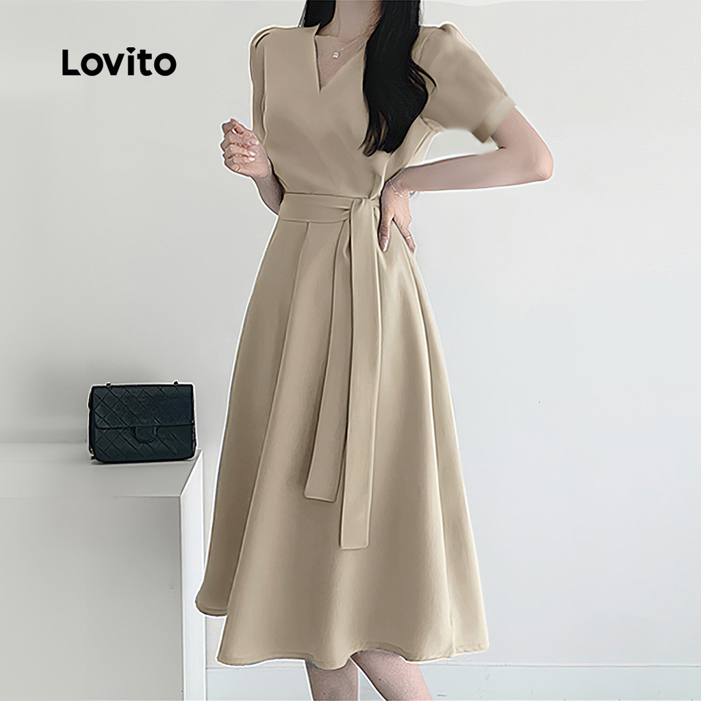 (Trendy) Lovito Vestido Casual liso plissado com cinto para mulheres L123ED759