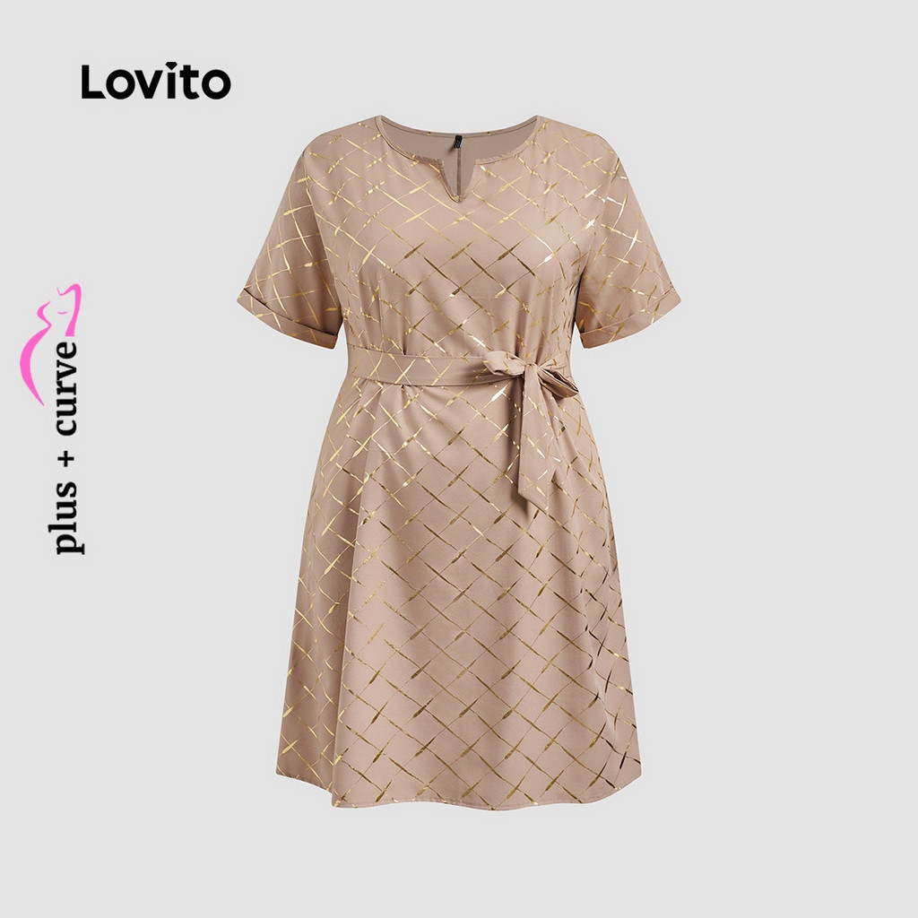 (Trendy) Lovito Vestido Plus Size curva Casual com textura geométrica e cinto de Metal para mulheres LBL23793