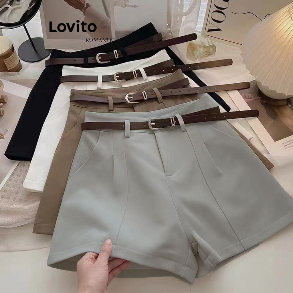 (Trendy2) Lovito Shorts Casuais Lisos Plissados Para Mulheres LNE73197