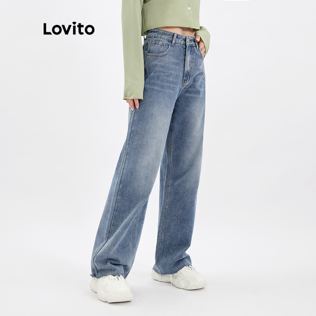 (trendy4)Lovito Calças Jeans Flare Casual Lisas com Cintura Alta L30AD050 (Azul)