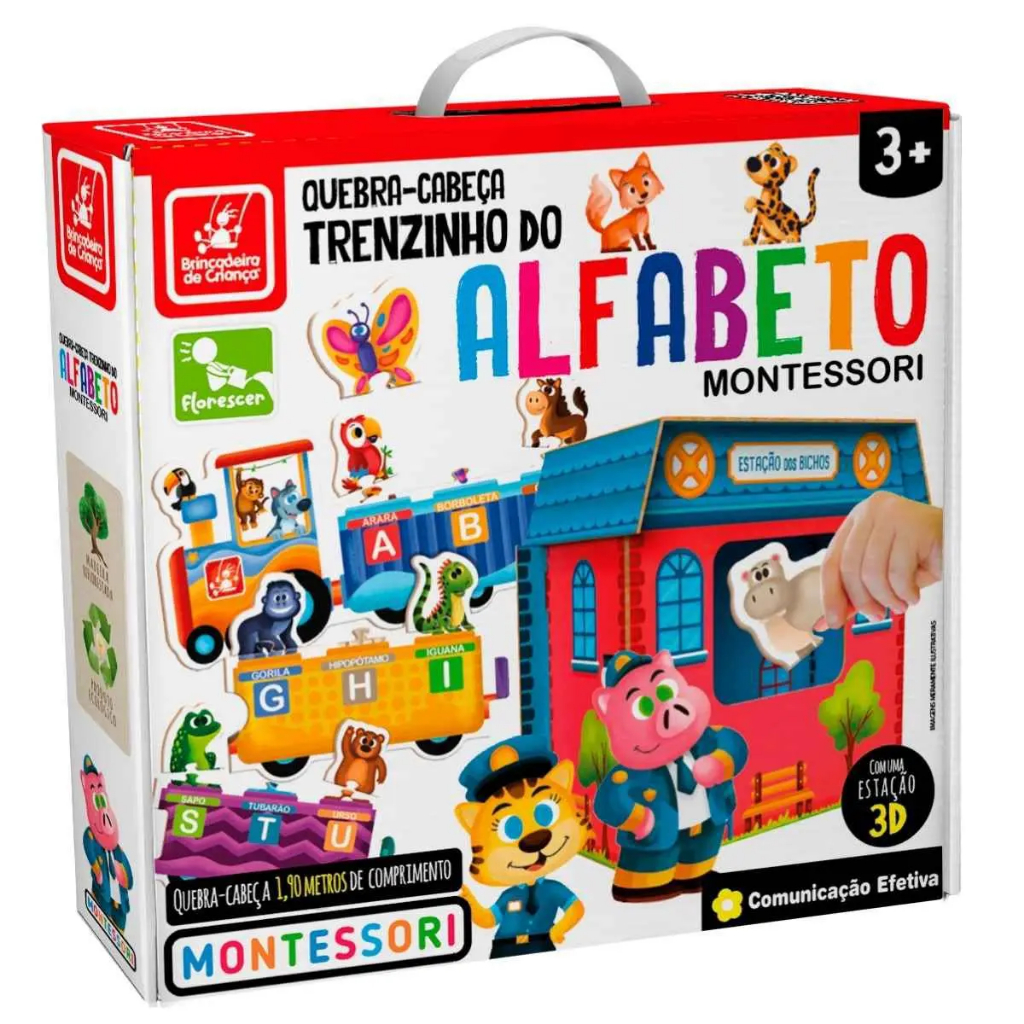 Trenzinho do Alfabeto Montessori - Brincadeira de Criança Esse quebra-cabeça além de super divertido, auxilia as crianças na alfabetização. O objetivo é montar o trem, seguindo a ordem das letras e dos animais que correspondem a cada letra. A brincadeira se torna ainda mais completa com a caixa sensorial em formato de estação de trem, nela as crianças pegam os animais sem vê-los, aprimorando assim um dos cinco sentidos, o tato.