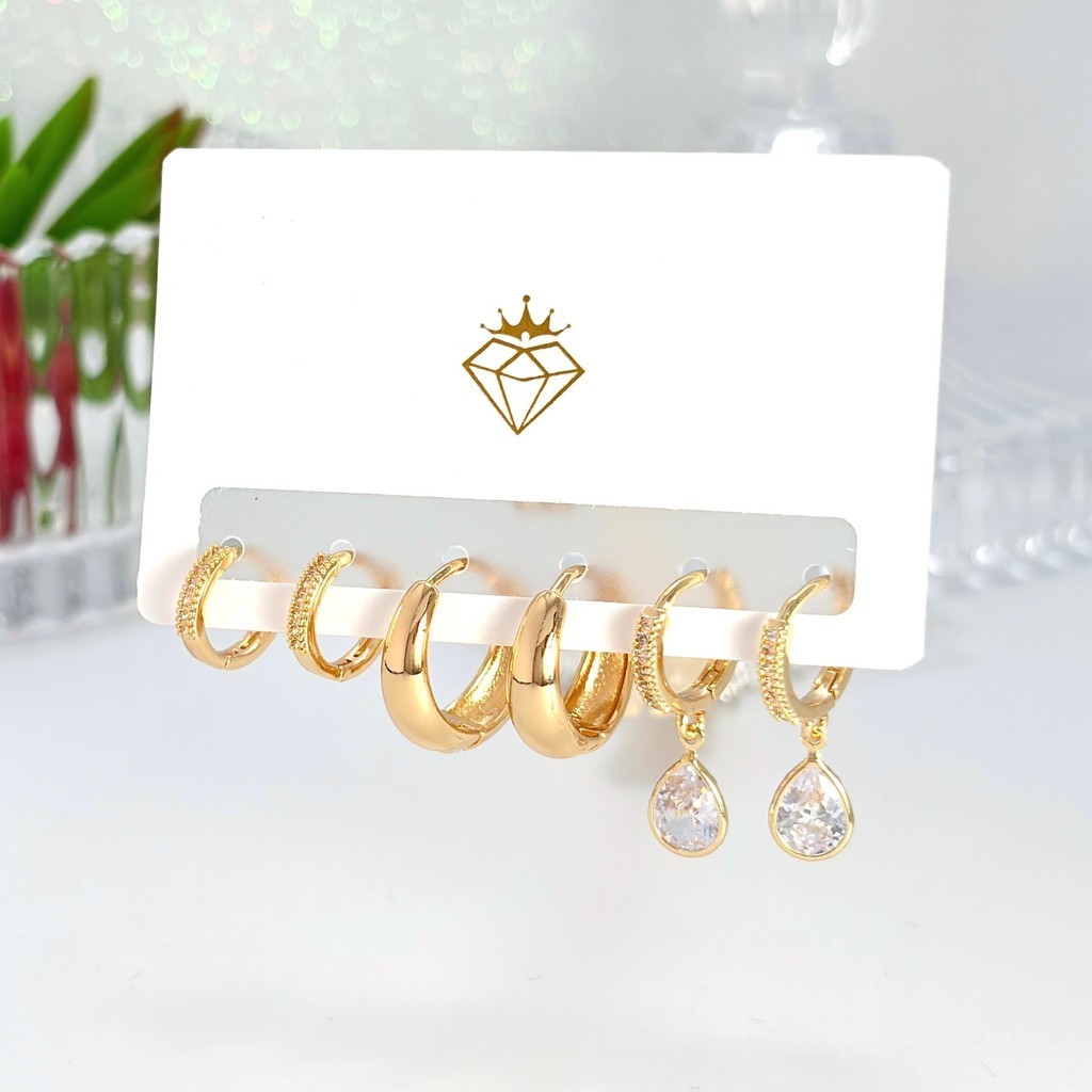 Três pares de brincos da moda com pingentes de zircônia em forma de lágrima Brincos de argola clássicos