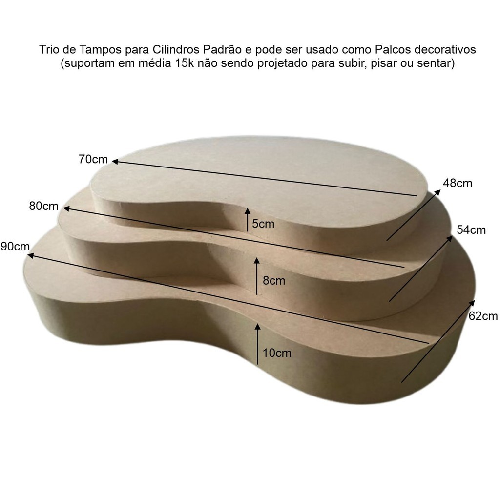 ATENÇÃO: OS CILINDROS DA FOTO SÃO VENDIDOS SEPARADAMENTE O ANUNCIO SE REFERE APENAS AOS TAMPOS. Este trio é composto por três tampos: Grande: 90x62x10a Médio: 80x54x8a Pequeno: 70x48x5a Serve nos cilindros padrão (50x80 cm, 44x58 cm e 38x45 cm). Nossos tampos/palcos não suportam peso humano, não pode sentar, subir ou pisar neles. Em média 15k de objetos decorativos. Limite de compra de 1 trio por vez pois não podem ser embalados juntos. Caso deseje outro trio, favor fazer outra compra.