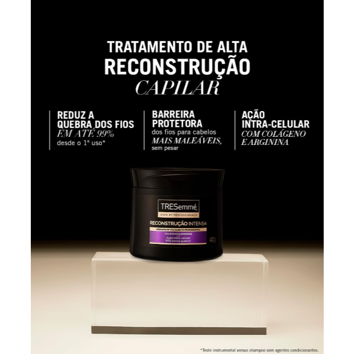 Conheça a tecnologia da Máscara de Tratamento TRESemmé Reconstrução e Força que fortalece os cabelos e reduz a quebra dos fios em até 99% desde o primeiro uso. Com uma avançada tecnologia de ação intracelular, seus cabelos ficarão visivelmente mais fortes e saudáveis. Um revolucionário tratamento de salão, tendência internacional, agora em sua casa. Experimente nossa linha de produtos profissionais que proporcionam cuidado intensivo, reparando e revitalizando os fios capilares. 1. Reduz a quebra dos fios: Com uma fórmula exclusiva especialmente desenvolvida para fortalecer os cabelos, e diminuindo até 99% da quebra desde o primeiro uso. Tenha fios mais resistentes e menos propensos a danos. 2. Ação intracelular: Com uma tecnologia de ação intracelular única, os produtos conseguem penetrar profundamente nos fios, nutrindo e fortalecendo-os desde o interior. Deixando os cabelos mais saudáveis e com menos quebras 3.Cabelos mais fortes desde o primeiro uso: Com a fórmula enriquecida com proteína, colágeno e aminoácidos, os produtos potencializam a ação do tratamento, proporcionando um fortalecimento intensivo aos fios. Conheça a linha que deixará seus cabelos visivelmente mais fortes e revitalizados desde o primeiro uso. TRESemmé, a marca aprovada por 9 em cada 10 cabeleireiros**. * Com o uso de shampoo, condicionador e máscara de tratamento TRESemmé ** Pesquisa realizada com profissionais de salão de beleza no Brasil.