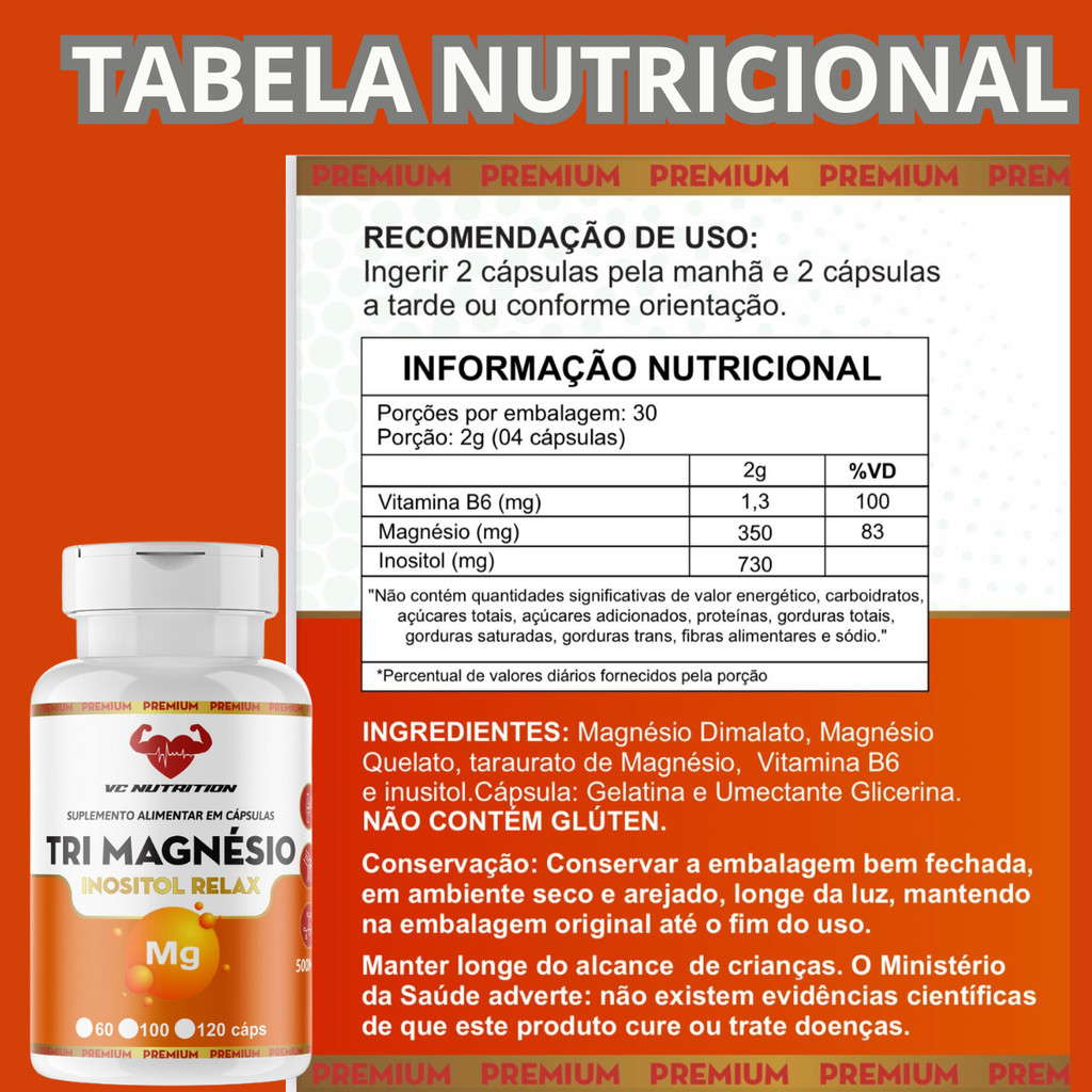 TrI Magnésio ( Dimalato - Quelato - Taraurato ) + Vitamina B6 + Inositol - Legitimo 100% original 120 cps 500mg O Tri Magnésio combina magnésio dimalato, quelato e taurato, formas altamente biodisponíveis, que apoiam a saúde muscular, óssea e nervosa. Junto com a vitamina B6, potencializa a absorção de magnésio, regula o metabolismo energético e alivia sintomas de fadiga e estresse. O inositol contribui para o equilíbrio hormonal, melhora a qualidade do sono e apoia a saúde mental. Este suplemento 100% original é ideal para quem busca mais energia, relaxamento muscular e bem-estar geral, ajudando na prevenção de câimbras, fortalecimento dos ossos e melhora da função cardiovascular. Uma fórmula completa para uma vida mais saudável e equilibrada. Atenção: Esse produto Nâo é medicamento ! É um suplemento alimentar